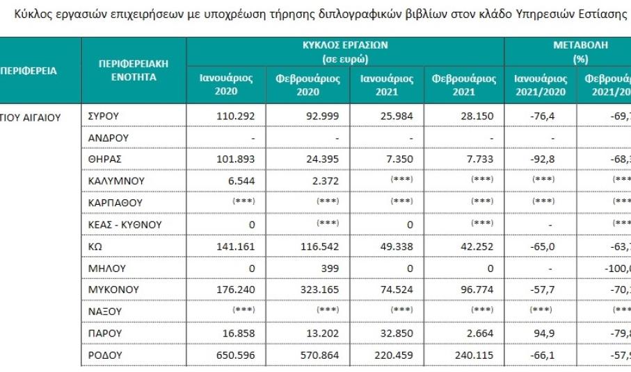 Για τις επιχειρήσεις του κλάδου υπηρεσιών εστίασης με υποχρέωση τήρησης διπλογραφικών βιβλίων, για τις οποίες υπάρχουν διαθέσιμα στοιχεία σε μηνιαία βάση, ο κύκλος εργασιών τον Φεβρουάριο 2021 ανήλθε σε 51.672.826 ευρώ, σημειώνοντας μείωση 55,4% σε σχέση με τον Φεβρουάριο 2020, όπου είχε ανέλθει σε 115.729.873 ευρώ.