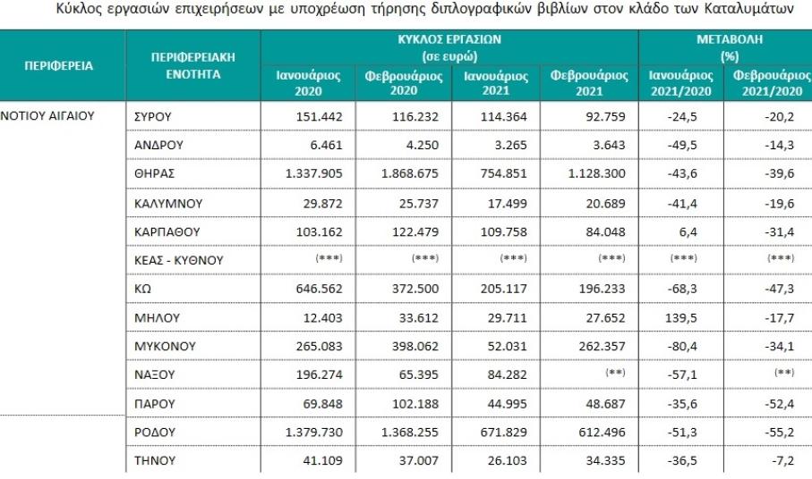 Για τις επιχειρήσεις του κλάδου παροχής καταλυμάτων με υποχρέωση τήρησης διπλογραφικών βιβλίων, για τις οποίες υπάρχουν διαθέσιμα στοιχεία σε μηνιαία βάση, ο κύκλος εργασιών τον Φεβρουάριο 2021 ανήλθε σε 24.595.138 ευρώ, σημειώνοντας μείωση 68,6% σε σχέση με τον Φεβρουάριο 2020, όπου είχε ανέλθει σε 78.223.504 ευρώ.