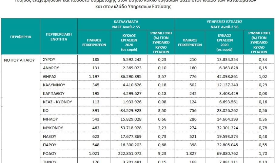 Η Ελληνική Στατιστική Αρχή (ΕΛΣΤΑΤ) παρουσιάζει τη χαρτογράφηση της εξέλιξης του κύκλου εργασιών των επιχειρήσεων που δραστηριοποιούνται στους κλάδους των Καταλυμάτων και των Υπηρεσιών Εστίασης. Οι κλάδοι αυτοί τίθενται διαχρονικά στο επίκεντρο του ενδιαφέροντος λόγω της βαρύτητας που έχουν στη διαμόρφωση των επιδόσεων της ελληνικής οικονομίας συνολικά, αλλά και της εκτεταμένης διασποράς τους, με σημαντική παρουσία σε όλες τις περιφερειακές ενότητες και σημαντική συμβολή στις αντίστοιχες τοπικές οικονομίες της Ελλάδας συχνά συσχετιζόμενη με το τουριστικό προϊόν της χώρας.