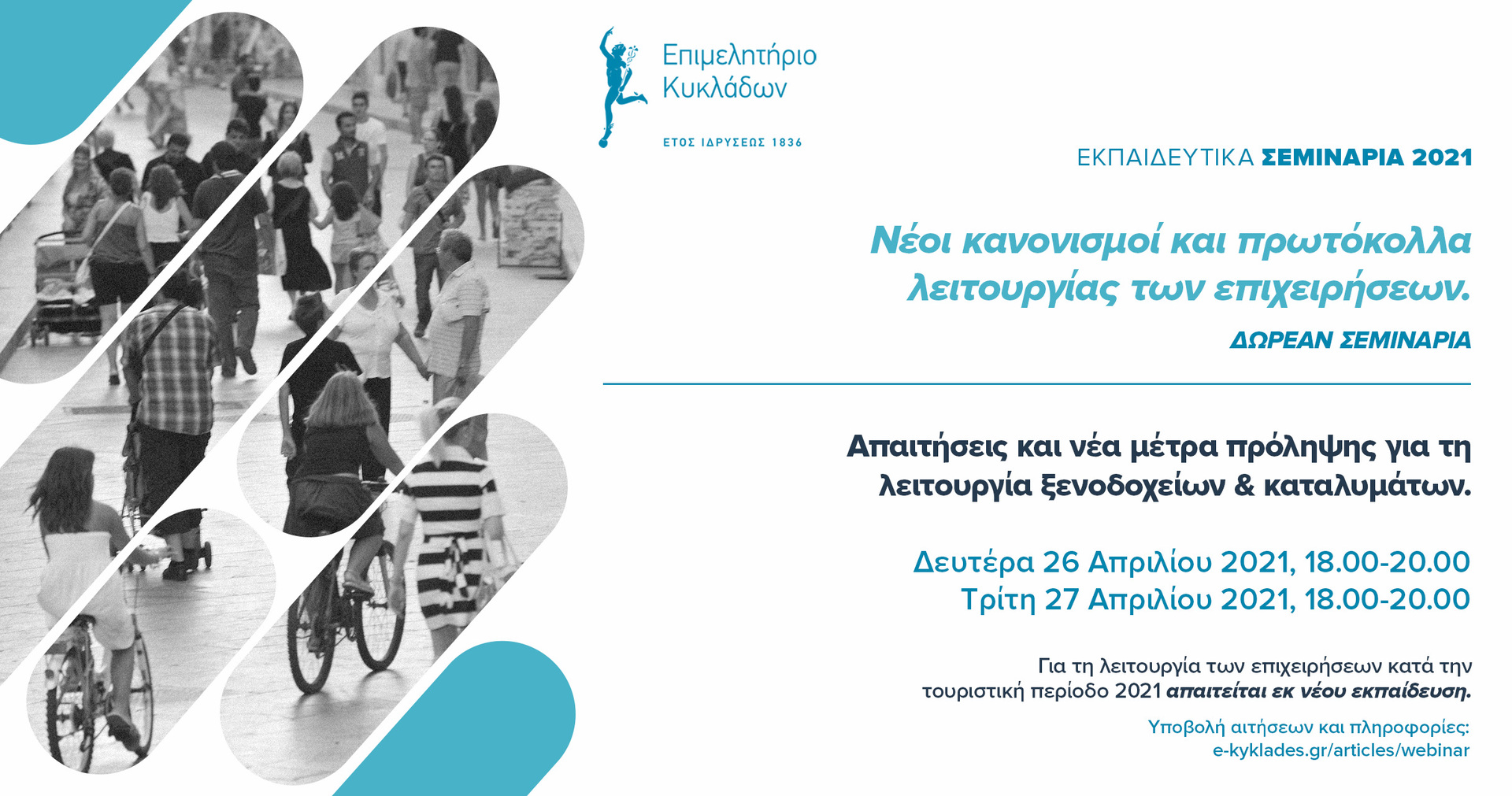 Το Επιμελητήριο Κυκλάδων, έπειτα από τη δημοσίευση της νέας ΚΥΑ για τα ειδικά πρωτόκολλα υγειονομικού περιεχομένου βάσει των οποίων λειτουργούν οι τουριστικές επιχειρήσεις στο πλαίσιο της λήψης μέτρων έναντι του κορωνοϊού COVID-19, ανακοινώνει τις ημερομηνίες διεξαγωγής των απαραίτητων δωρεάν εκπαιδευτικών σεμιναρίων προκειμένου τα μέλη του να ενημερωθούν έγκαιρα και έγκυρα και να προετοιμαστούν σωστά για το άνοιγμα της φετινής σεζόν.