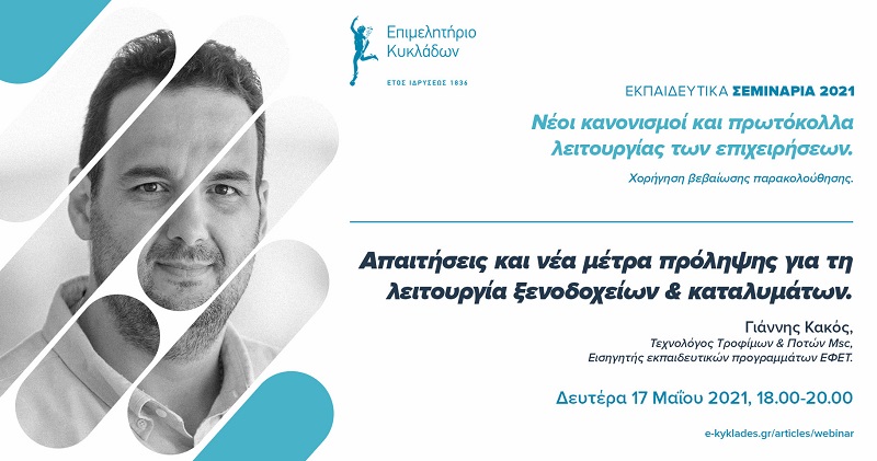 Το Επιμελητήριο Κυκλάδων, έπειτα από τη δημοσίευση της νέας ΚΥΑ για τα ειδικά πρωτόκολλα υγειονομικού περιεχομένου βάσει των οποίων λειτουργούν οι τουριστικές επιχειρήσεις στο πλαίσιο της λήψης μέτρων έναντι του κορωνοϊού COVID-19, ανακοινώνει το τρίτο κατά σειρά δωρεάν και απαραίτητο εκπαιδευτικό σεμινάριο προκειμένου όλα τα μέλη του να ενημερωθούν έγκαιρα και έγκυρα και να προετοιμαστούν σωστά για το άνοιγμα της φετινής σεζόν.
