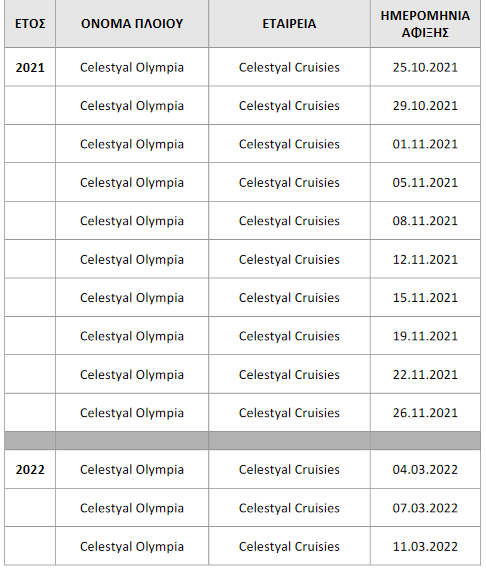 Επιπλέον παρατίθεται πίνακας των εκτός σεζόν αφίξεων της εταιρείας Celestyal Cruises, η οποία «επανέρχεται στη Σύρο και για πρώτη φορά θα φέρει οργανωμένους επισκέπτες εισοδηματικού ενδιαφέροντος από το Κουσάντασι της Τουρκίας. Εφόσον βεβαίως οι επιδημιολογικές συνθήκες επιτρέψουν τις αφίξεις αυτές, ως Επιμελητήριο Κυκλάδων σε συνεργασία με το Λιμενικό Ταμείο Σύρου και τον Εμπορικό Σύλλογο θα προσπαθήσουμε να τις αξιοποιήσουμε με τον καλύτερο δυνατό τρόπο για το νησί μας».