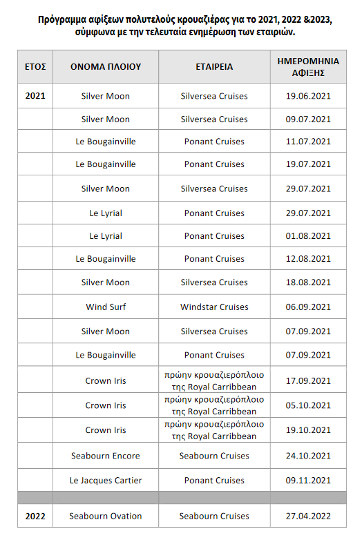 Ενημέρωση προς τα μέλη του παρέχει το Επιμελητήριο Κυκλάδων, αναφορικά με την επανεκκίνηση του τομέα της κρουαζιέρας στην Πρωτεύουσα των Κυκλάδων, ανακοινώνοντας τις αφίξεις για την περίοδο 2021-2023.