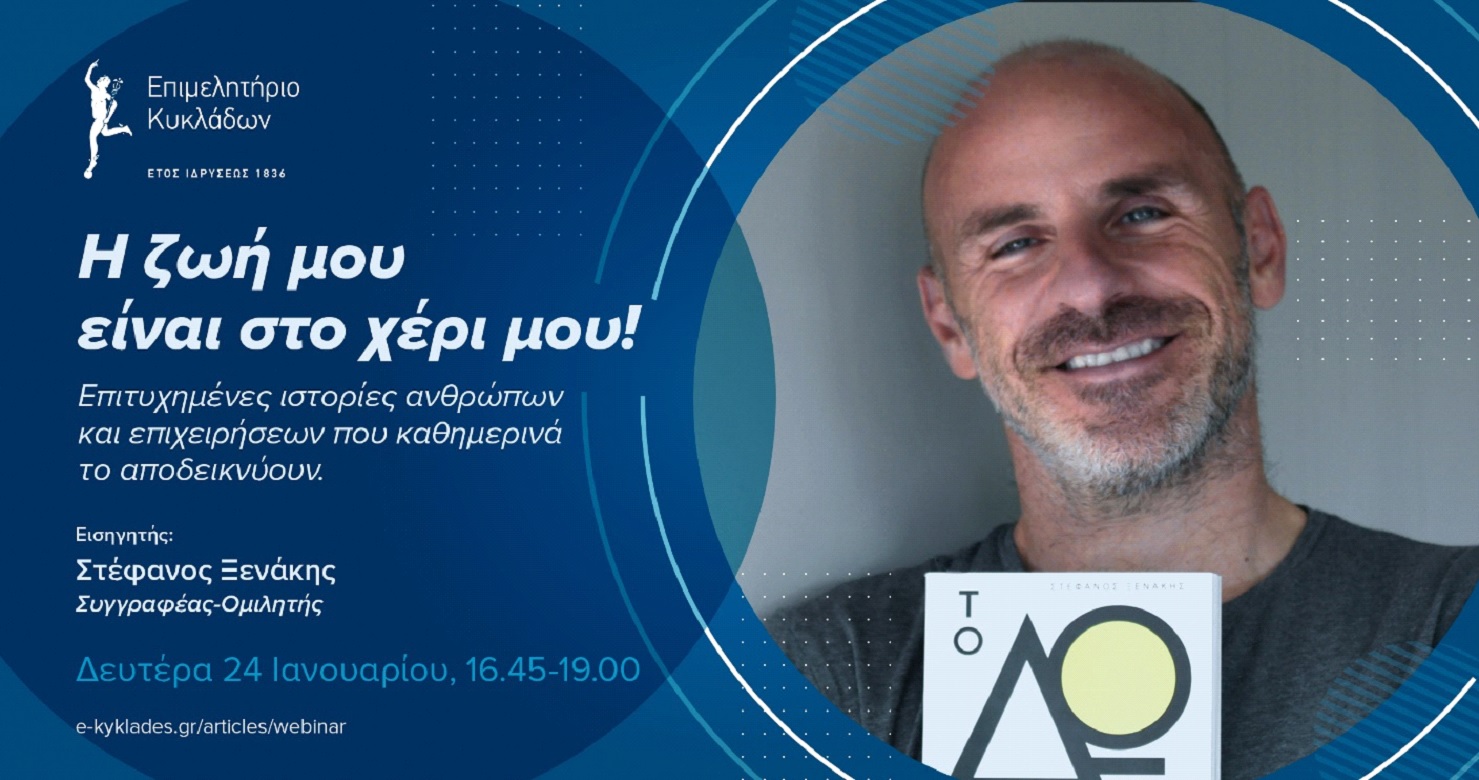 Πώς όμως θα αναγνωρίσει ο καθένας τις δικές του δυνάμεις και τον ρόλο που μπορεί να παίξει σε μια συλλογική προσπάθεια; Τις απαντήσεις θα μας δώσει ο Στέφανος Ξενάκης, γνωστός σε όλους ομιλητής σε θέματα αυτοβελτίωσης και προσωπικής εξέλιξης, συγγραφέας του μπεστ σέλερ «Το Δώρο», στο ειδικό webinar που διοργανώνει το Επιμελητήριο Κυκλάδων για τα μέλη του και τους εργαζόμενους στις επιχειρήσεις τους τη Δευτέρα 24 Ιανουαρίου 2022, στις 16.45-19.00.