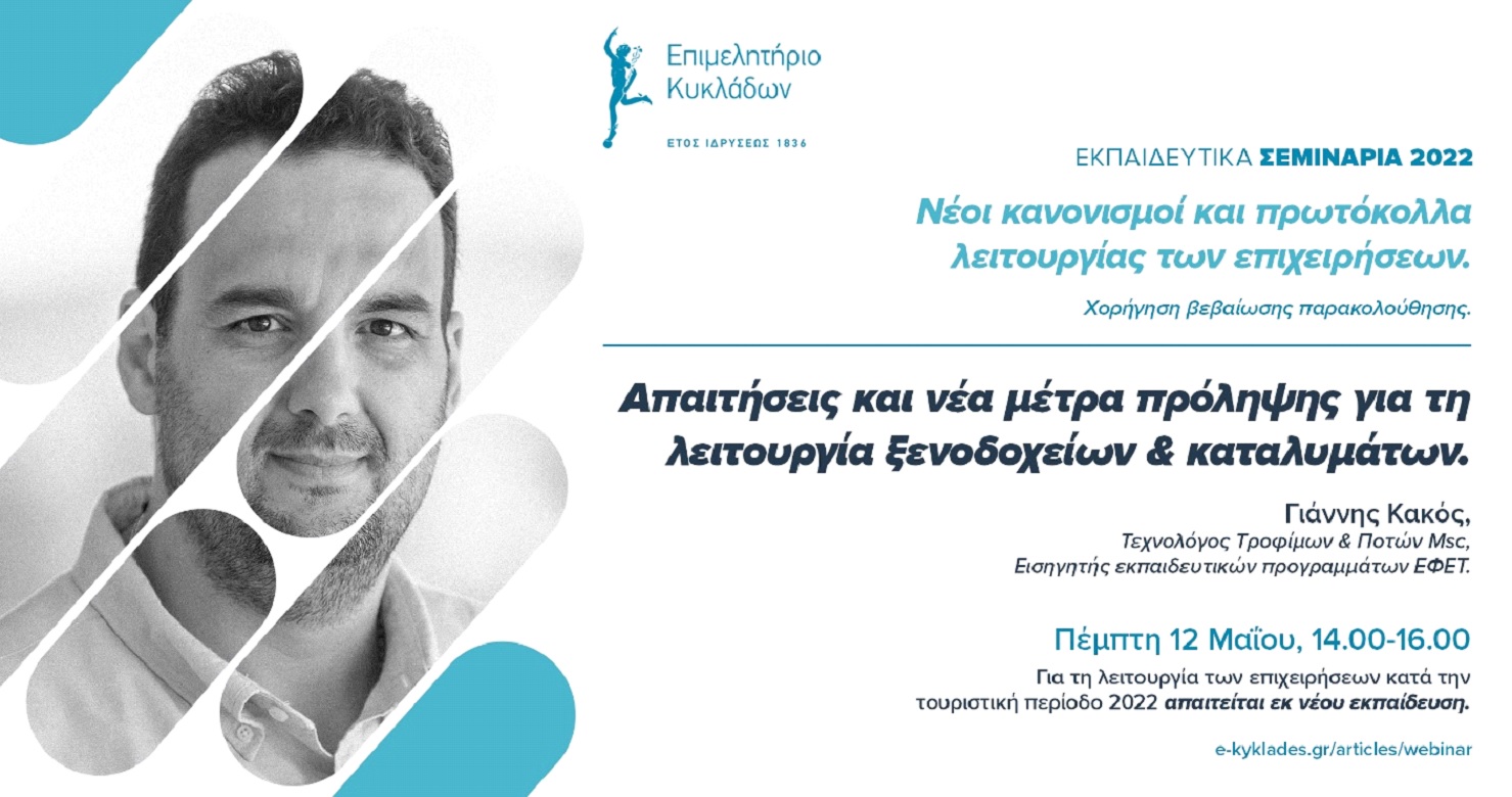 Καθώς οι θέσεις για το σεμινάριο της Τετάρτης 11 Μαΐου για τα Υγειονομικά Πρωτόκολλα για τη λειτουργία καταλυμάτων το 2022 έχουν συμπληρωθεί, το Επιμελητήριο Κυκλάδων ενημερώνει τα μέλη του ότι θα πραγματοποιηθεί και τρίτο δωρεάν webinar