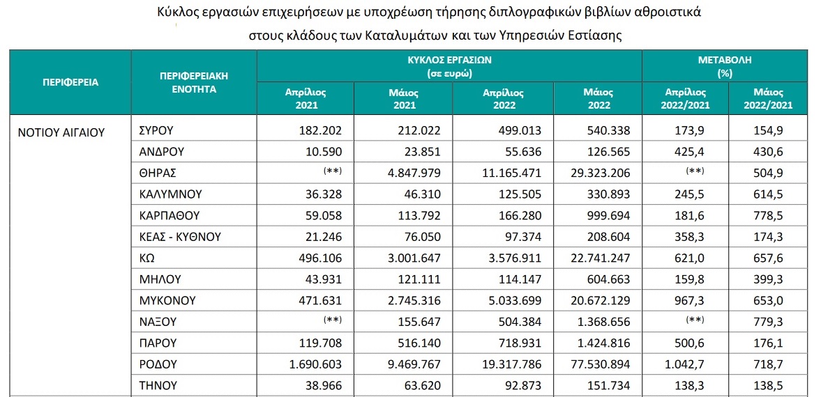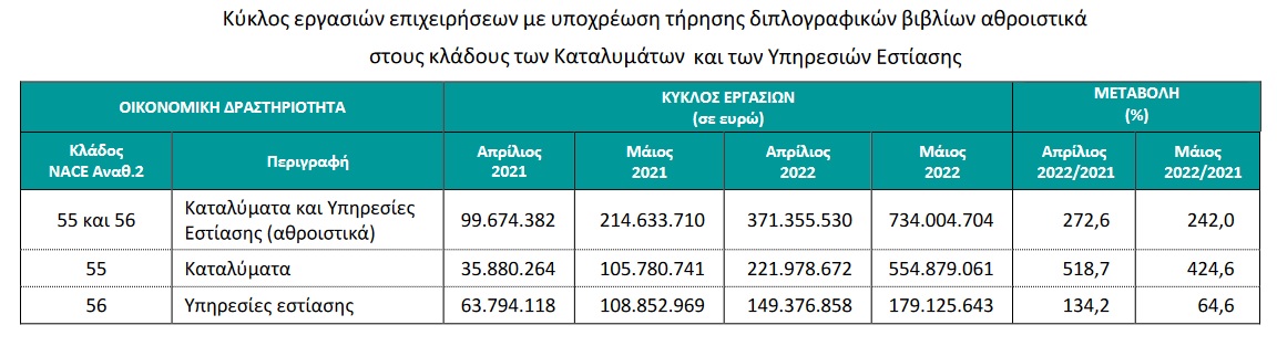 Αθροιστικά για τις επιχειρήσεις στους κλάδους των καταλυμάτων και των υπηρεσιών εστίασης, με υποχρέωση τήρησης διπλογραφικών βιβλίων, για τις οποίες υπάρχουν διαθέσιμα στοιχεία σε μηνιαία βάση, ο κύκλος εργασιών τον Μάιο 2022 ανήλθε σε 734.004.704 ευρώ, σημειώνοντας αύξηση 242,0% σε σχέση με τον Μάιο 2021, όπου είχε ανέλθει σε 214.633.710 ευρώ.