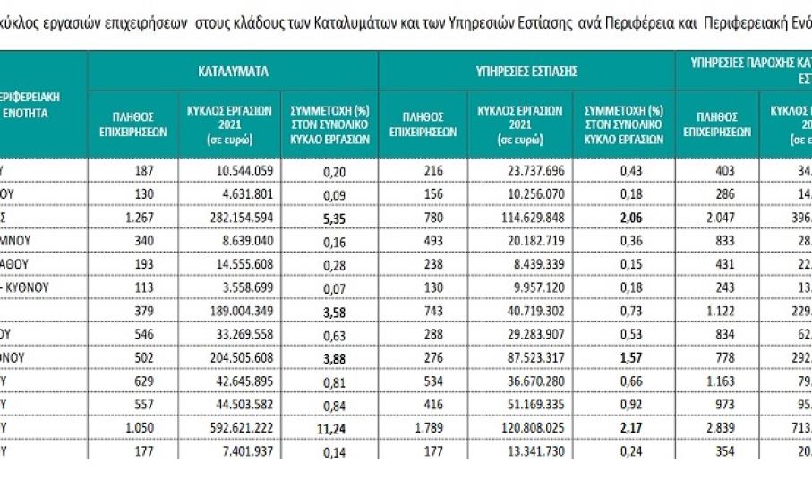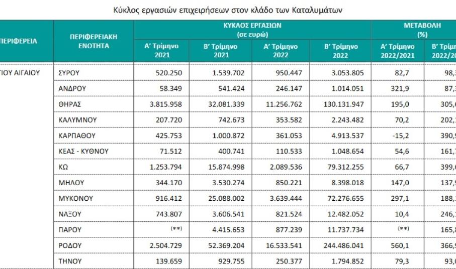 Στο σύνολο των επιχειρήσεων του κλάδου των καταλυμάτων, ο κύκλος εργασιών το δεύτερο τρίμηνο 2022 ανήλθε σε 2.051.499.115 ευρώ, σημειώνοντας αύξηση 238,8% σε σχέση με το δεύτερο τρίμηνο 2021, όπου είχε ανέλθει σε 605.517.814 ευρώ. Για τις επιχειρήσεις των Περιφερειακών Ενοτήτων με συνεισφορά στον συνολικό κύκλο εργασιών έτους 2021 μεγαλύτερη από 1,0%, η μεγαλύτερη αύξηση στον κύκλο εργασιών το δεύτερο τρίμηνο 2022 σε σύγκριση με το δεύτερο τρίμηνο 2021 παρατηρήθηκε στην Περιφερειακή Ενότητα Κω (399,6%) και η μικρότερη αύξηση (125,8%) καταγράφηκε στην Περιφερειακή Ενότητα Χαλκιδικής.