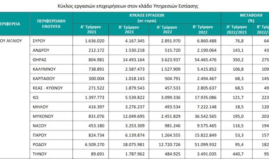 Στο σύνολο των επιχειρήσεων του κλάδου των υπηρεσιών εστίασης, ο κύκλος εργασιών το δεύτερο τρίμηνο 2022 ανήλθε σε 1.931.545.816 ευρώ, σημειώνοντας αύξηση 70,2% σε σχέση με το δεύτερο τρίμηνο 2021, όπου είχε ανέλθει σε 1.134.960.057 ευρώ. Για τις επιχειρήσεις των Περιφερειακών Ενοτήτων με συνεισφορά στον συνολικό κύκλο εργασιών έτους 2021 μεγαλύτερη από 1,0%, η μεγαλύτερη αύξηση στον κύκλο εργασιών το δεύτερο τρίμηνο 2022 σε σύγκριση με το δεύτερο τρίμηνο 2021 παρατηρήθηκε στην Περιφερειακή Ενότητα Θήρας (275,8%) και η μικρότερη αύξηση (32,3%) καταγράφηκε στην Περιφερειακή Ενότητα Αχαΐας.