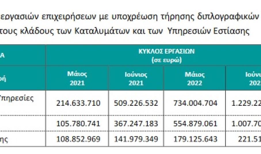 Για τις επιχειρήσεις στους κλάδους των καταλυμάτων και των υπηρεσιών εστίασης, με υποχρέωση τήρησης διπλογραφικών βιβλίων, για τις οποίες υπάρχουν διαθέσιμα στοιχεία σε μηνιαία βάση, ο κύκλος εργασιών τον Ιούνιο 2022 ανήλθε σε 1.229.227.641 ευρώ, σημειώνοντας αύξηση 141,4% σε σχέση με τον Ιούνιο 2021, όπου είχε ανέλθει σε 509.226.532 ευρώ. Για τις επιχειρήσεις των Περιφερειακών Ενοτήτων με συνεισφορά στον συνολικό κύκλο εργασιών έτους 2021 μεγαλύτερη από 1,0%, η μεγαλύτερη αύξηση στον κύκλο εργασιών τον Ιούνιο 2022 σε σύγκριση με τον Ιούνιο 2021 παρατηρήθηκε στην Περιφερειακή Ενότητα Κω (325,5%) και η μικρότερη αύξηση (58,0%) καταγράφηκε στην Περιφερειακή Ενότητα Αχαΐας.