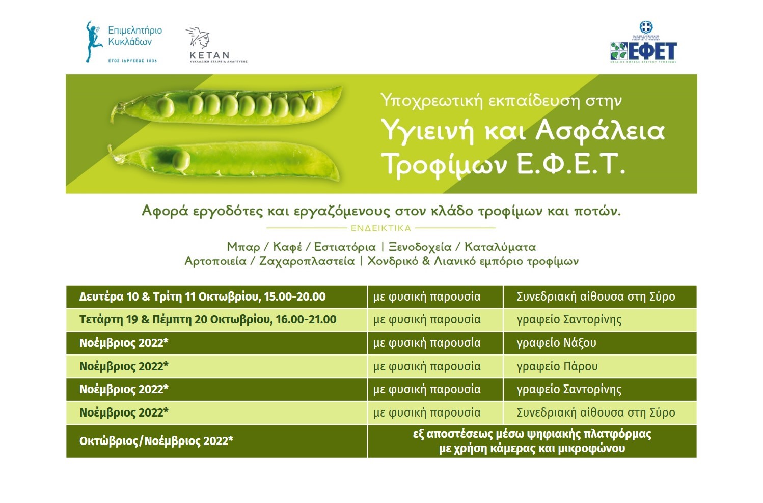 Το Επιμελητήριο Κυκλάδων ανακοινώνει τη διεξαγωγή εκπαιδευτικών σεμιναρίων σε θέματα Υγιεινής & Ασφάλειας Τροφίμων (Ε.Φ.Ε.Τ.) τους μήνες Οκτώβριο και Νοέμβριο τόσο με φυσική παρουσία στα νησιά Πάρου, Νάξου, Σαντορίνης και Σύρου όσο και εξ’ αποστάσεως για κάθε εργαζόμενο στις Κυκλάδες με καταληκτική ημερομηνία υποβολής στις 15 Σεπτεμβρίου .