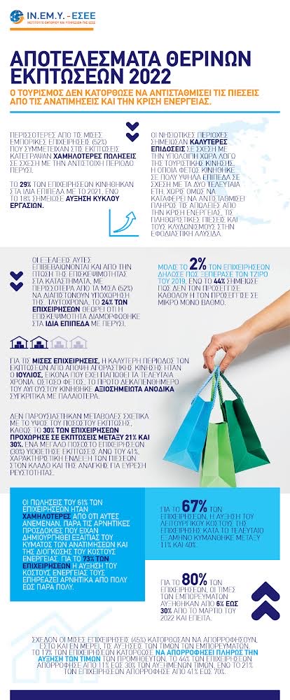 Οι θερινές εκπτώσεις του 2022 ολοκληρώθηκαν σε ένα περιβάλλον πολλαπλών αντιφάσεων. Η κρίση στην αγορά ενέργειας φαίνεται πως επιδρά χωρίς χρονική υστέρηση και με διττό τρόπο στη λειτουργία των εμπορικών επιχειρήσεων: Άμεσα, λόγω της αύξησης του λειτουργικού κόστους και έμμεσα λόγω της απομείωσης της εσωτερικής ζήτησης, εξαιτίας της πτώσης του διαθέσιμου εισοδήματος. Επιπρόσθετα, η πληθωριστική κρίση, η οποία έχει ενταθεί λόγω της εισβολής της Ρωσίας στην Ουκρανία, επηρεάζει καθοδικά τις προσδοκίες για το χειμώνα, καθιστώντας τα καταναλωτικά πρότυπα περισσότερο συσταλτικά. Από την άλλη πλευρά, η εντυπωσιακή αύξηση των τουριστικών αφίξεων και εισπράξεων τονώνει σημαντικά την εξωτερική ζήτηση, τόσο σε σύγκριση με το 2020, κυρίως, αλλά και το 2021. Ως εκ τούτου, οι τουριστικές αγορές καταγράφουν αρκετά πιο έντονη δυναμική ανάκτησης σε σύγκριση με τις περισσότερο περιφερειακές αγορές, γεγονός το οποίο τεκμηριώνει τις χωρικές ανισότητες που φαίνεται πως επιταχύνει η ενεργειακή κρίση στο οικοσύστημα του λιανικού εμπορίου. Τα ευρήματα αυτά επιβεβαιώνονται από τις έρευνες των κατά τόπους Εμπορικών Συλλόγων.