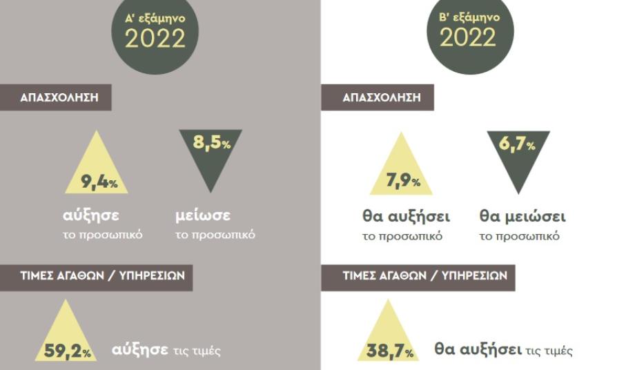 Παράλληλα, οι επιπτώσεις από τις ανατιμήσεις εντείνονται. Το κόστος λειτουργίας των επιχειρήσεων συνεχίζει να αυξάνεται καθώς με βάση τα ευρήματα της έρευνας αυξήθηκε μεσοσταθμικά το κόστος ενέργειας κατά 76%, το κόστος προμήθειας πρώτων υλών και εμπορευμάτων κατά 43,5%, το κόστος καυσίμων οχημάτων κατά 57,8% και το κόστος προμήθειας εξοπλισμού και μηχανημάτων κατά 26,2%. Συνέπεια του αυξημένου κόστους λειτουργίας ήταν να καταγραφεί νέος ιστορικά υψηλός αριθμός επιχειρήσεων που αύξησαν τις τιμές πώλησης αγαθών/υπηρεσιών. Το πρώτο εξάμηνο του 2022, 6 στις 10 μικρές και πολύ μικρές επιχειρήσεις (59,2%) προχώρησαν σε αύξηση των τιμών τους.