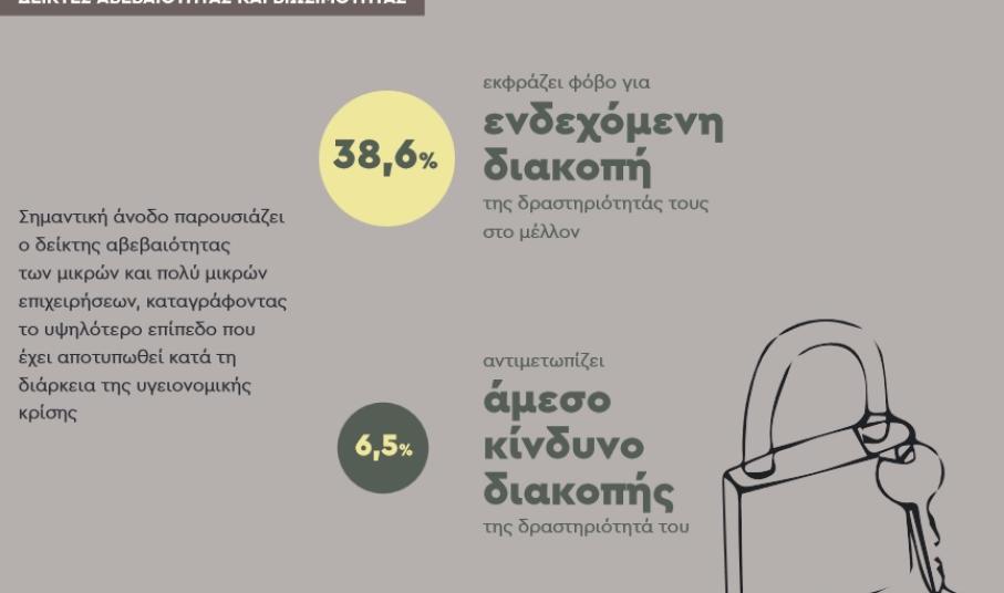 Τέλος, αρνητικές παραμένουν οι προσδοκίες για το μέλλον. Σημαντική, μάλιστα, άνοδο παρουσιάζει ο δείκτης αβεβαιότητας των μικρών και πολύ μικρών επιχειρήσεων, καταγράφοντας το υψηλότερο επίπεδο που έχει αποτυπωθεί από την εκδήλωση της υγειονομικής κρίσης. Συγκεκριμένα, σχεδόν 4 στις 10 επιχειρήσεις (38,6%) εκφράζουν φόβο για ενδεχόμενη διακοπή της δραστηριότητάς τους στο μέλλον. Αντίστοιχα, ο δείκτης βιωσιμότητας των μικρών και πολύ μικρών επιχειρήσεων καταγράφει το χειρότερο ποσοστό από την έναρξη της υγειονομικής κρίσης με το 6,5% των μικρών και πολύ μικρών επιχειρήσεων να αντιμετωπίζει άμεσο κίνδυνο διακοπής της δραστηριότητας του.