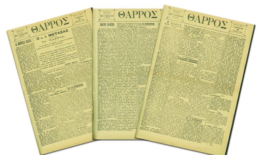 Το “Θάρρος” εκδόθηκε πρώτη φορά στις 20 Αυγούστου 1924, µε ιδιοκτήτη, διευθυντή και υπεύθυνο της έκδοσης, τον τυπογράφο και ιδιοκτήτη του τυπογραφείου Νικόλαο Γ. Βαρθαλίτη και πορεύθηκε µέχρι και τις 25 Οκτωβρίου του 1940.