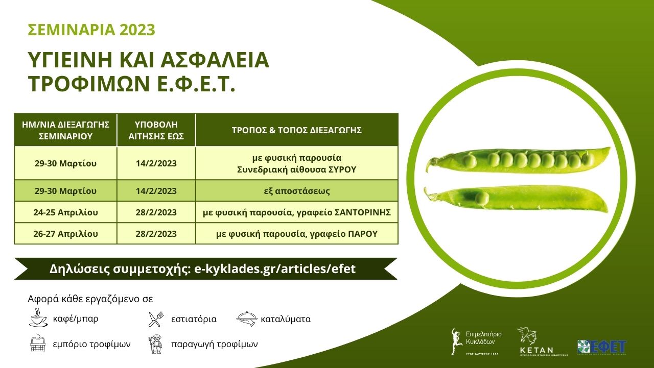 Το Επιμελητήριο Κυκλάδων ενημερώνει όλους τους ενδιαφερόμενους για τη διοργάνωση νέων σεμιναρίων ΕΦΕΤ με φυσική παρουσία στα νησιά Σύρου, Πάρου και Σαντορίνης την περίοδο Μαρτίου-Απριλίου, απαραίτητο για κάθε εργαζόμενο στον κλάδο τροφίμων και ποτών, ως εξής: