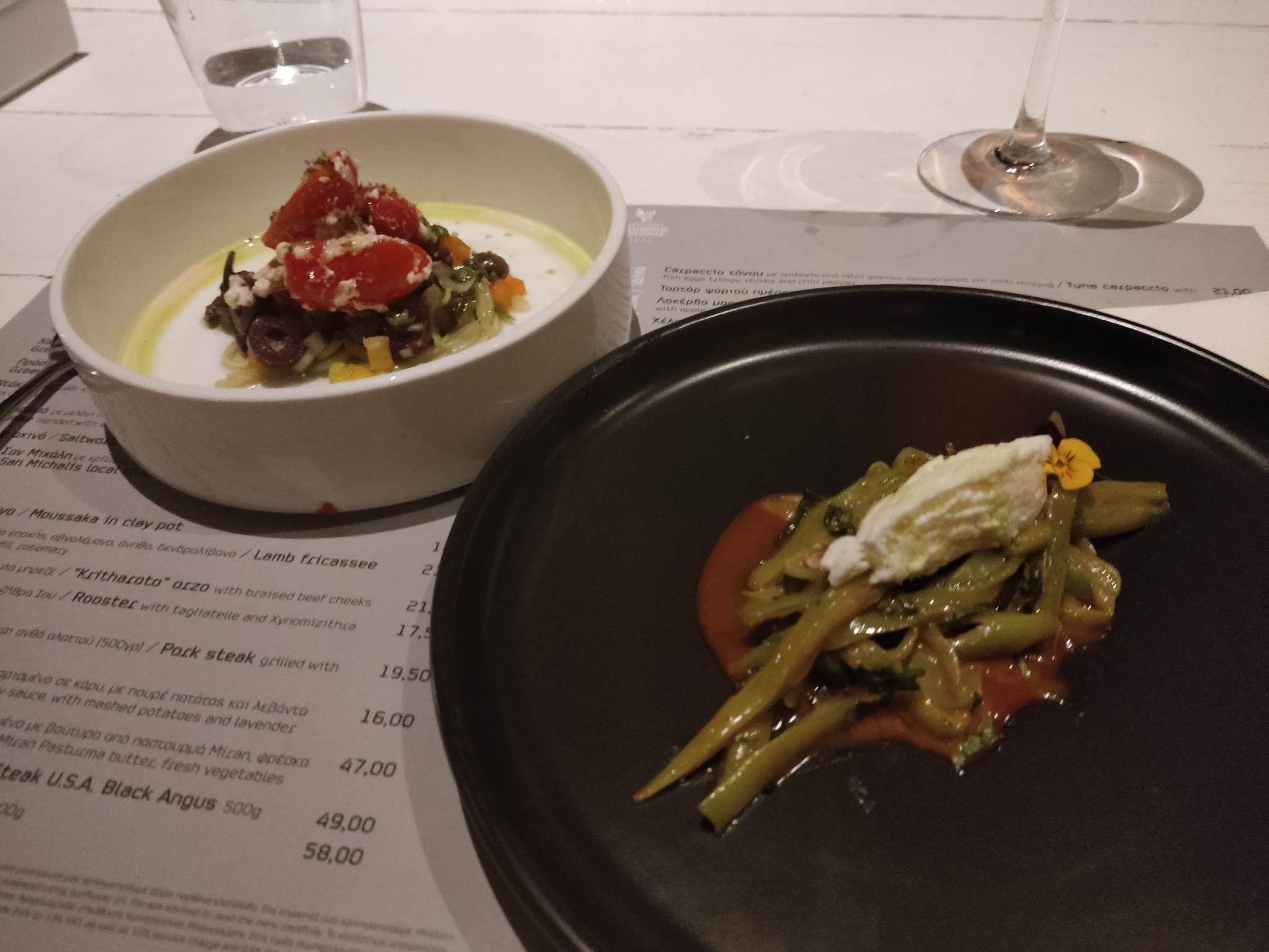 Σαλάτα φασολάκια, με δυόσμο, βασιλικό , ξινό τυρί Σύρου (Αrmeo) και βινεγκρέτ πετιμέζι