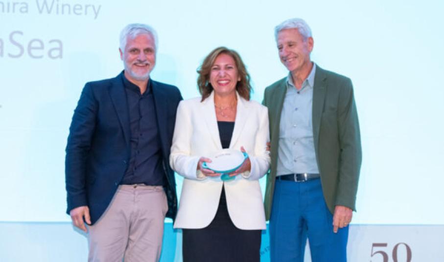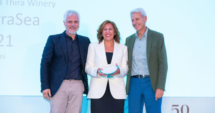 Οι τρεις οινοποιοί της Μικράς Θήρας, Βασίλης Τσακτσαρλής, Ιωάννα Βαμβακούρη και Βαγγέλης Γεροβασιλείου, παρέλαβαν το βραβείο τους κατά την τελετή απονομής των βραβείων για τα 50 Great Greek Wines 2023.
