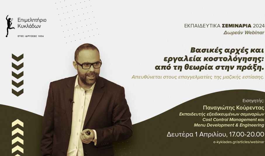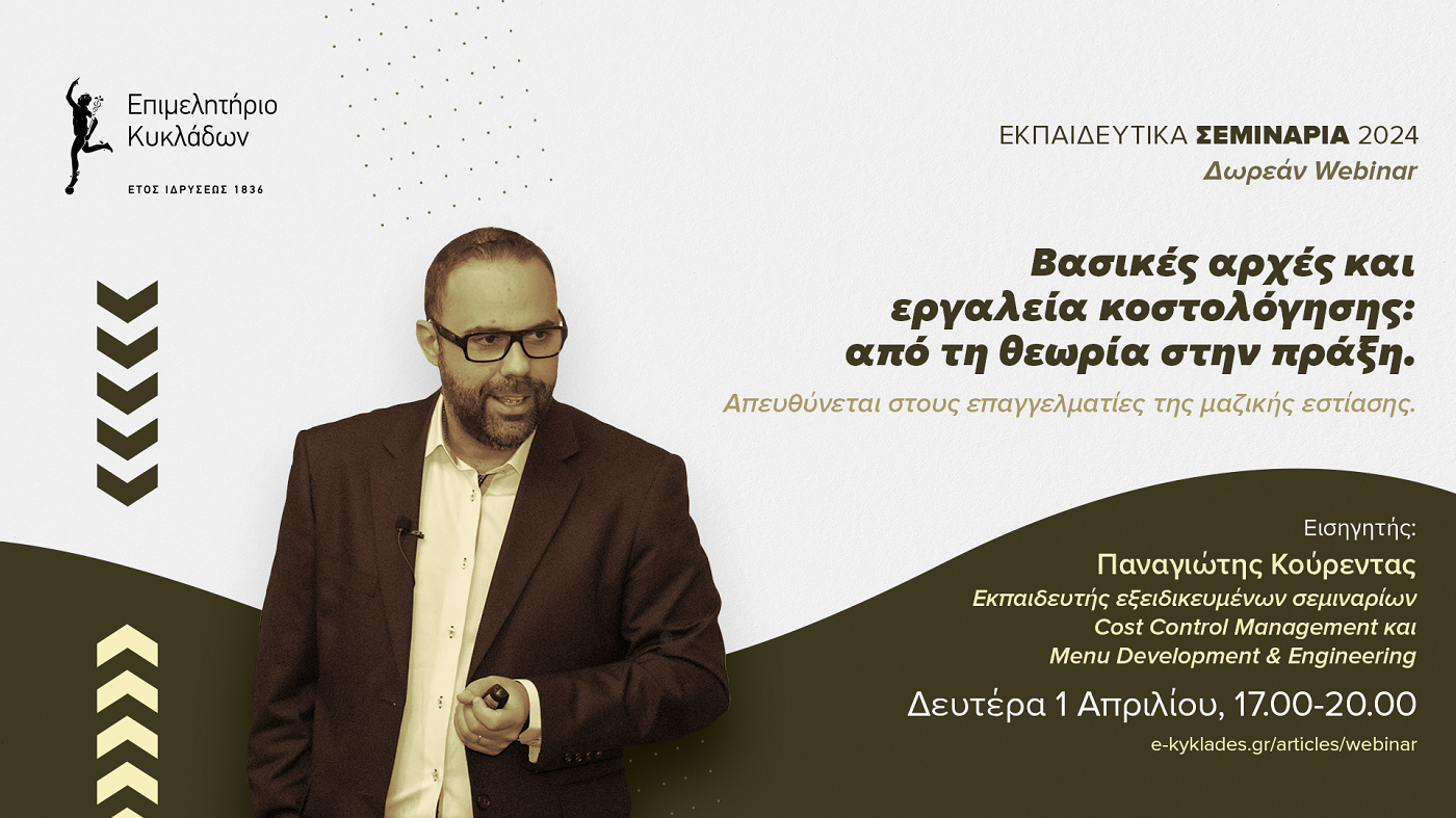 Εισηγητής: Παναγιώτης Κούρεντας, εκπαιδευτής εξειδικευμένων σεμιναρίων γύρω από το Cost Control Management και το Menu Development & Engineering.