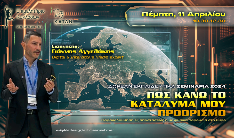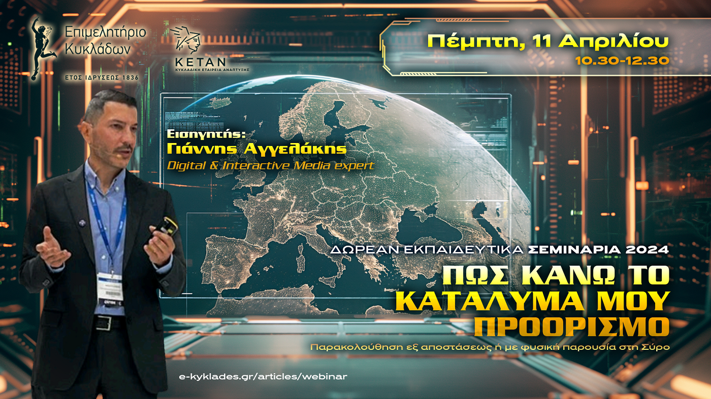 Στο πλαίσιο αυτό της συνεχούς εκπαίδευσης και υποστήριξης των μελών του, το Επιμελητήριο Κυκλάδων, σε συνεργασία με το Ελληνικό Ανοικτό Πανεπιστήμιο, το Πανεπιστήμιο Δυτικής Αττικής και καταξιωμένους στον τομέα τους εισηγητές, πραγματοποιεί μια νέα σειρά δωρεάν εκπαιδευτικών webinar για τα μέλη του.