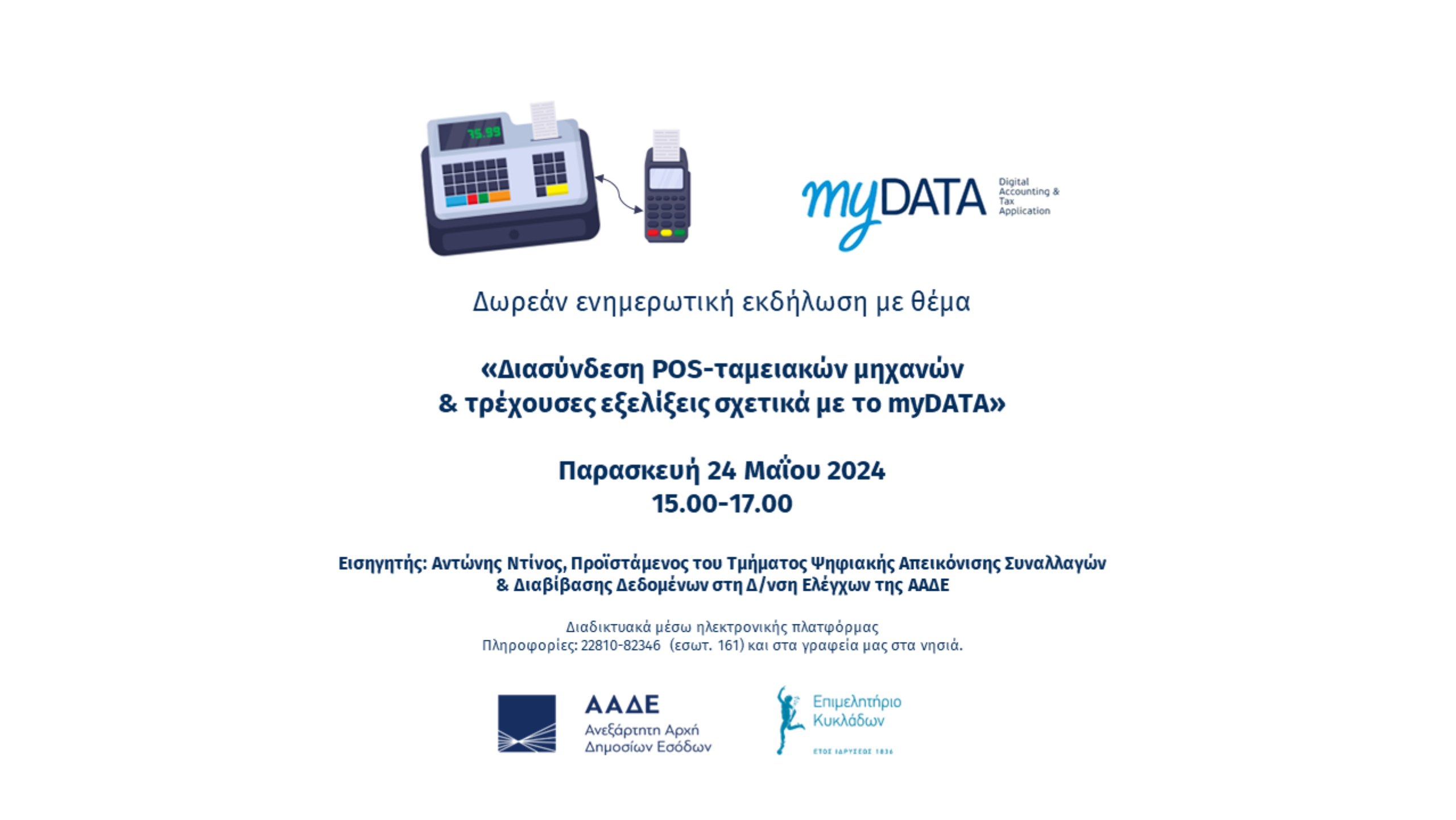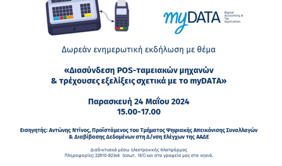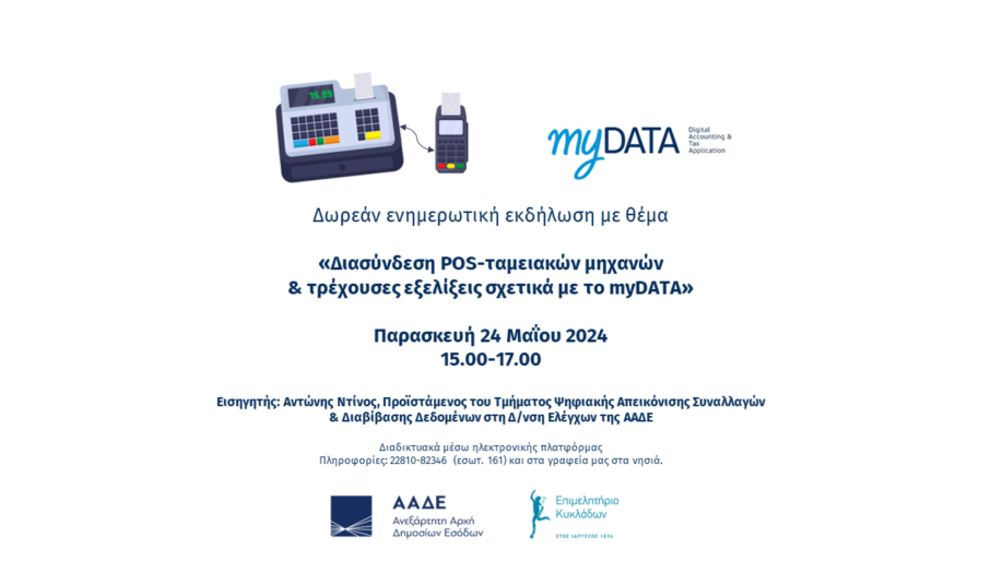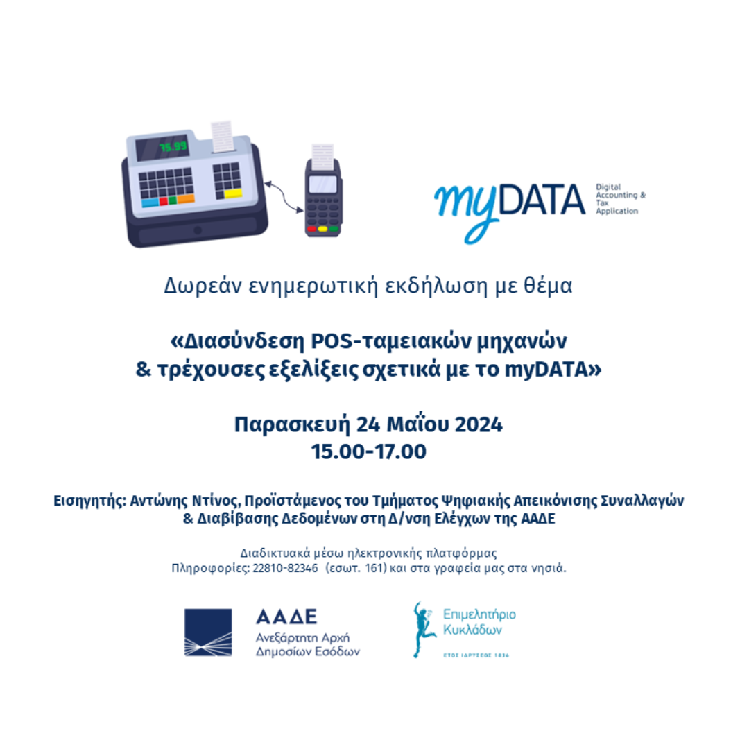 Με στόχο την ενημέρωση των επιχειρήσεων–μελών του αλλά και τη παρουσίαση και ανάδειξη των τοπικών ιδιαιτεροτήτων, το Επιμελητήριο Κυκλάδων σε συνεργασία με το Υπουργείο Οικονομικών και την Ανεξάρτητη Αρχή Δημοσίων Εσόδων, διοργανώνει τη δωρεάν ενημερωτική εκδήλωση με τίτλο: «Διασύνδεση POS-ταμειακών μηχανών και τρέχουσες εξελίξεις σχετικά με το Mydata», την Παρασκευή 24 Μαΐου 15.00-17.00.
