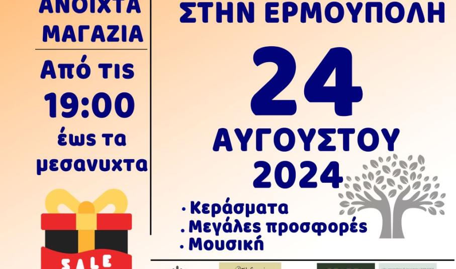 Τα καταστήματα θα είναι ανοιχτά από τις 7 το απόγευμα έως και τα μεσάνυχτα με τον Εμπορικό Σύλλογο Σύρου, αλλά και τους καταστηματάρχες να έχουν προγραμματίσει κεράσματα, μουσική και φυσικά, μεγάλες προσφορές για τους καταναλωτές.