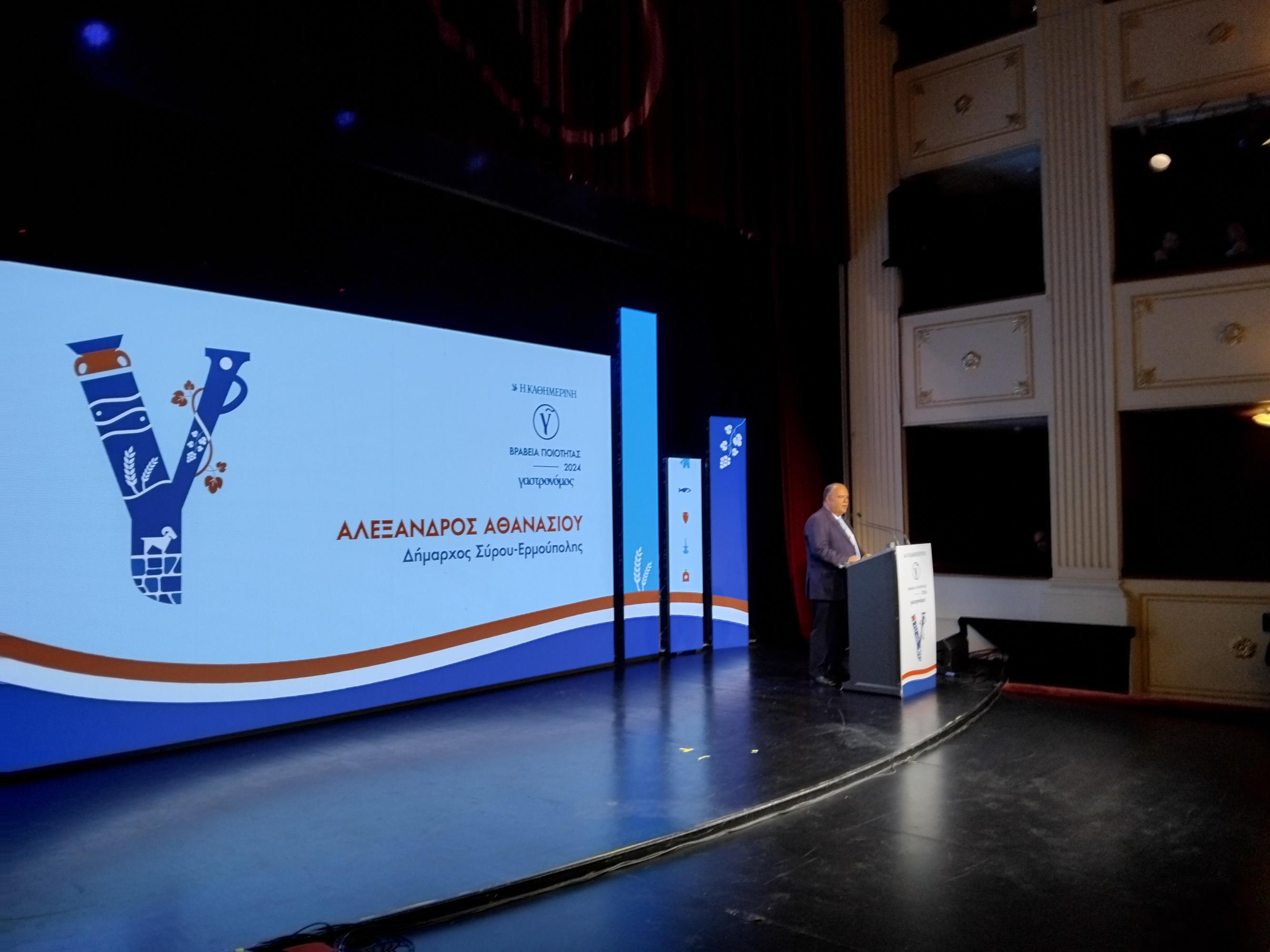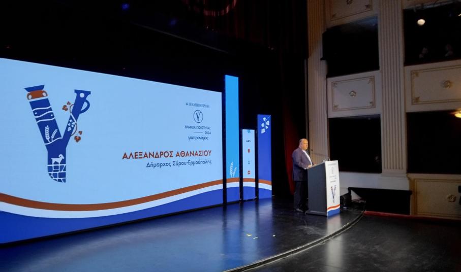 Την έναρξη της βραδιάς έκανε ο δήμαρχος Σύρου - Ερμούπολης, Αλέξης Αθανασίου, ο οποίος απευθυνόμενος προς τους παρευρισκόμενους, αναφέρθηκε στη σημαντική εκδήλωση που έλαβε χώρα στη Σύρο και δη στο εμβληματικό θέατρο Απόλλων, εκδήλωση, που όπως είπε, αποτελεί, επιβράβευση των προσπαθειών των μικρών παραγωγών και μεταποιητών της χώρας, με τη σκυτάλη της απονομής των βραβείων να παίρνει ο διευθυντής της εφημερίδας "Καθημερινή", Αλέξης Παπαχελάς.