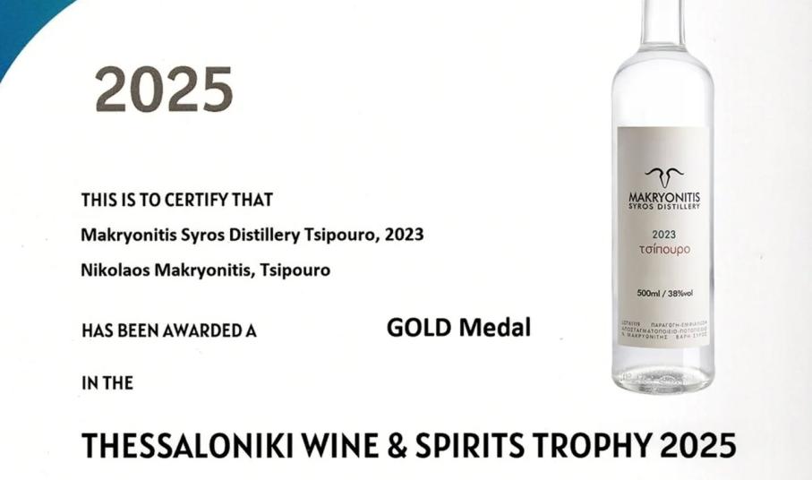 - Η νέα χρονιά μπήκε με τον καλύτερο τρόπο για το Makryonitis Syros Distillery, καθώς πρόσφατα ξεχώρισε στον Διεθνή Διαγωνισμό Οίνου και Αποσταγμάτων Θεσσαλονίκης 2025, κατακτώντας πέντε μετάλλια. Τι σημαίνει ακόμη νέα βράβευση για την επιχείρηση;