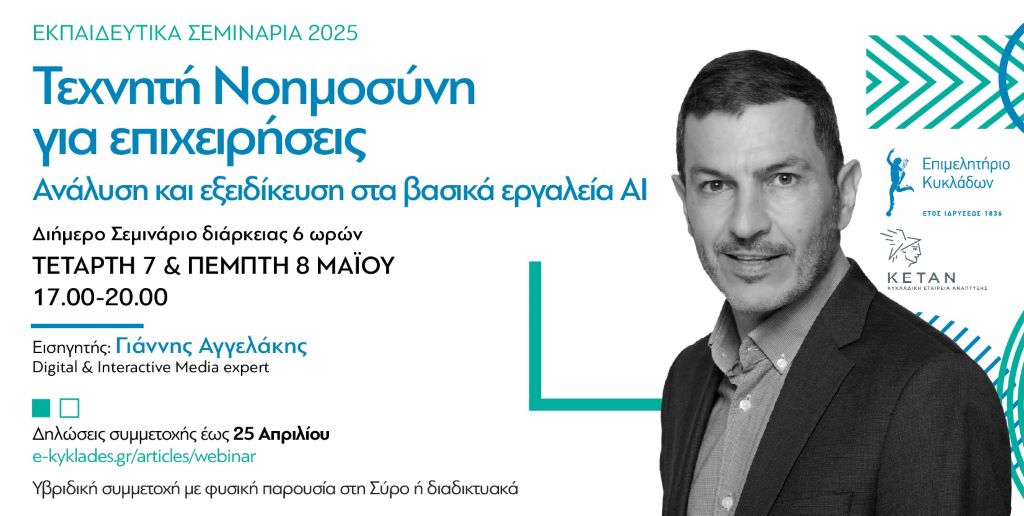 Μετά από τη μεγάλη ανταπόκριση που είχε το ενημερωτικό σεμινάριο σχετικά με τις εξελίξεις στην Τεχνητή Νοημοσύνη, το Επιμελητήριο Κυκλάδων, ανταποκρινόμενο στα αιτήματα των μελών του διοργανώνει την Τετάρτη 7 και την Πέμπτη 8 Μαΐου από τις 17.00 έως τις 20.00, ένα διήμερο, εξειδικευμένο workshop, διάρκειας 6 ωρών, με θέμα “Τεχνητή Νοημοσύνη για επιχειρήσεις: Ανάλυση και εξειδίκευση στα βασικά εργαλεία ΑΙ”, με εισηγητή τον Γιάννη Αγγελάκη, Digital & Interactive Media expert.