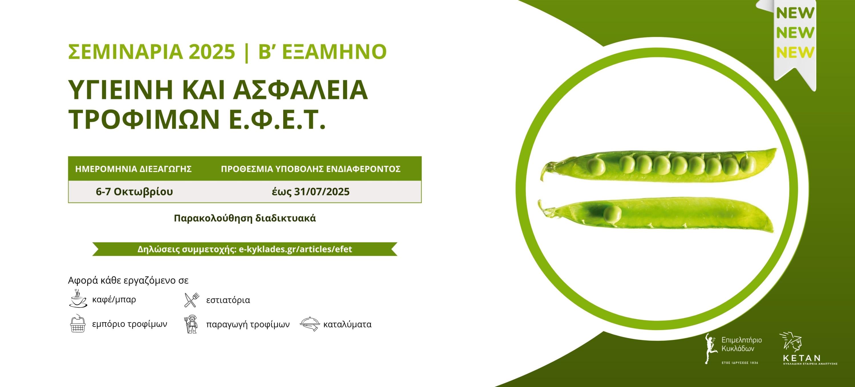 Σεμινάρια Υγιεινής και Ασφάλειας Τροφίμων (Ε.Φ.Ε.Τ.) για το β’ εξάμηνο του 2025, θα διοργανώσει στις 6 και 7 Οκτωβρίου, το Επιμελητήριο Κυκλάδων.