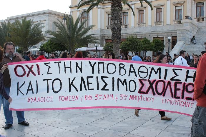 Με τη συμμετοχή 100 περίπου ατόμων, πραγματοποιήθηκε χθες το απόγευμα το συλλαλητήριο στην πλατεία Μιαούλη, ενάντια των περικοπών των οργανικών θέσεων στα δημοτικά σχολεία της Σύρου.
