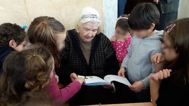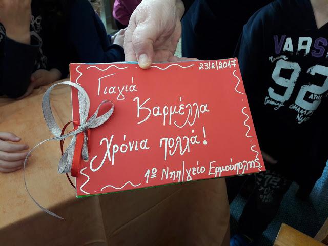 Σημειώνεται μάλιστα, πως μία ομάδα παιδιών του σχολείου, συνοδευόμενα από τη νηπιαγωγό τους και δύο μέλη του Συλλόγου Γονέων και Κηδεμόνων, έκαναν έκπληξη στη γιαγιά Καρμέλλα, η οποία έσβησε το 87ο κεράκι της στην τούρτα, που έφτιαξε με χαρά μία μητέρα. Εκτός από πολλές ευχές, οι μαθητές χάρισαν στην εορτάζουσα και ένα μικρό λεύκωμα ζωγραφικής με τις δημιουργίες τους. Τα παιδιά τραγούδησαν, έφαγαν, έπαιξαν και επέστρεψαν στο σχολείο τους. Οι επισκέψεις αυτές εντάσσονται στο πλαίσιο της συνεργασίας μεταξύ του ιδρύματος και του 1ου Νηπιαγωγείου, με στόχο να έρθουν τα παιδιά κοντά στους ηλικιωμένους και να τους γνωρίσουν, αποκομίζοντας τη σοφία τους.