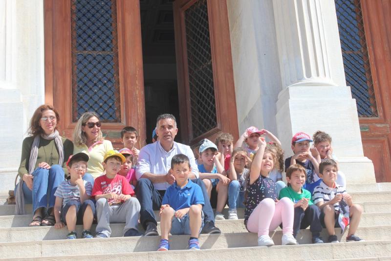 Πρώτος «σταθμός» της χαρούμενης ομάδας ήταν το Δημαρχιακό Μέγαρο Σύρου – Ερμούπολης, κτίριο που σχεδιάστηκε από τον Γερμανό αρχιτέκτονα Ερνέστο Τσίλλερ και θεμελιώθηκε το 1876. Μαθητές, γονείς και εκπαιδευτικοί, ξεναγήθηκαν στους χώρους του και θαύμασαν, μεταξύ άλλων, τους εντυπωσιακούς τοσκανικούς κίονές του, την προτομή του Δημάρχου Δημητρίου Βαφιαδάκη και τη θερινή άμαξα περιπάτου της Πριγκίπισσας Σίσσυ της Αυστρίας. Στην παρέα τους βρέθηκε και ο Αντιδήμαρχος Μάριος Βουτσίνος, ο οποίος έβαλε το «χεράκι» του για την πραγματοποίηση της επίσκεψης. Τέλος, οι μαθητές έκαναν «έκπληξη» στον Δήμαρχο Σύρου-Ερμούπολης, Γιώργο Μαραγκό, ο οποίος τους υποδέχτηκε με χαρά στο γραφείο του. Ο ίδιος μίλησε στα παιδιά για την ιστορία του Δημαρχείου, τους έδειξε παλαιές φωτογραφίες της πλατείας Μιαούλη χωρίς αυτό, τα ενημέρωσε για τη μελλοντική δημιουργία παιδικού «ινδιάνικου χωριού» στον Γαλησσά και απάντησε με προθυμία στις ερωτήσεις τους, εισπράττοντας μάλιστα το χαριτωμένο σχόλιο ενός κοριτσιού «είστε πολύ όμορφος». Οι μαθητές ενθουσιάστηκαν με τις οροφογραφίες του κτιρίου και φωτογραφήθηκαν μαζί με τον Δήμαρχο στα σκαλιά του Δημαρχείου.