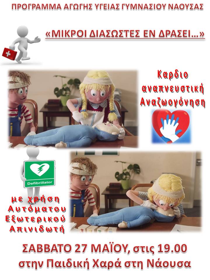 Ανοιχτή επίδειξη Καρδιοαναπνευστικής Αναζωογόνησης με χρήση Αυτόματου Εξωτερικού Απινιδωτή και Θέσης Ασφαλείας θα πραγματοποιήσουν το Σάββατο 27 Μαίου 2017 στην Παιδική Χαρά (μπροστά στο Ιατρείο) μαθητές της Α΄ τάξης του Γυμνασίου Νάουσας Πάρου.