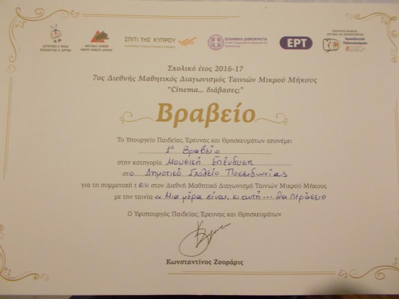 Το βραβείο πρωτότυπης μουσικής σύνθεσης για την ταινία "Μια μέρα είναι κι αυτή... θα περάσει" απέσπασε η κινηματογραφική ομάδα του Δημοτικού Σχολείου Ποσειδωνίας στον 7ο Διεθνή Διαγωνισμό Μαθητικών Ταινιών Μικρού Μήκους.