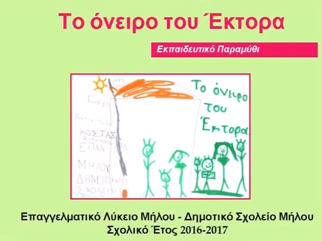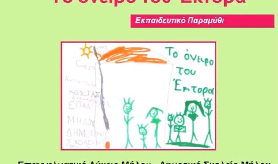 Το παραμύθι με τίτλο «Το όνειρο του Έκτορα» αποτελεί «καρπό» των προγραμμάτων Αγωγής Υγείας με θέμα την Ασφάλεια κατά τη χρήση Ηλεκτρονικών Συσκευών, που υλοποιούν το Επαγγελματικό Λύκειο και το Δημοτικό Σχολείου της Μήλου.
