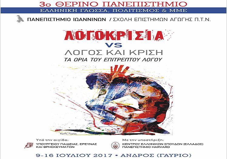 Ανακοινώθηκε το πρόγραμμα του 3ου Θερινού Πανεπιστημίου «Ελληνική Γλώσσα, Πολιτισμός και Μέσα Μαζικής Επικοινωνίας» που οργανώνεται από το Πανεπιστήμιο Ιωαννίνων, υποστηρίζεται από το Κέντρο Ελληνικών Σπουδών (Ελλάδος) του Πανεπιστημίου Χάρβαρντ και τελεί υπό την αιγίδα του Υπουργείου Παιδείας, Έρευνας και Θρησκευμάτων. Το πρόγραμμα, που φέτος φέρει τον ειδικό τίτλο «Η λογοκρισία απέναντι στον λόγο και στην κρίση. Τα όρια του επιτρεπτού λόγου», θα πραγματοποιηθεί από 9-16 Ιουλίου στο Γαύριο της Άνδρου και οι εγγραφές των ενδιαφερομένων να το παρακολουθήσουν θα συνεχιστούν σε όλη τη διάρκεια του Ιουνίου.
