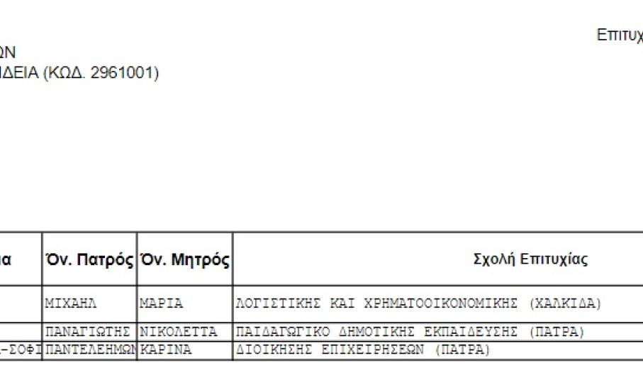 Παραπάνω μπορείτε να δείτε τους επιτυχόντες στα τμήματα της Τριτοβάθμιας Εκπαίδευσης, από τα Λύκεια της Μυκόνου, όπως ανακοινώθηκαν από τις λίστες του Υπουργείου Παιδείας Έρευνας και Θρησκευμάτων.