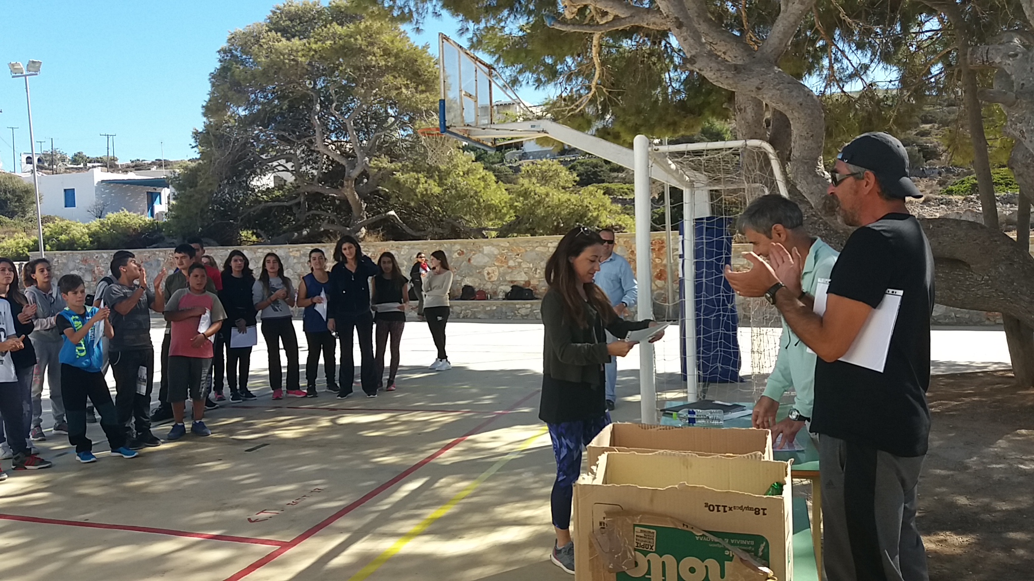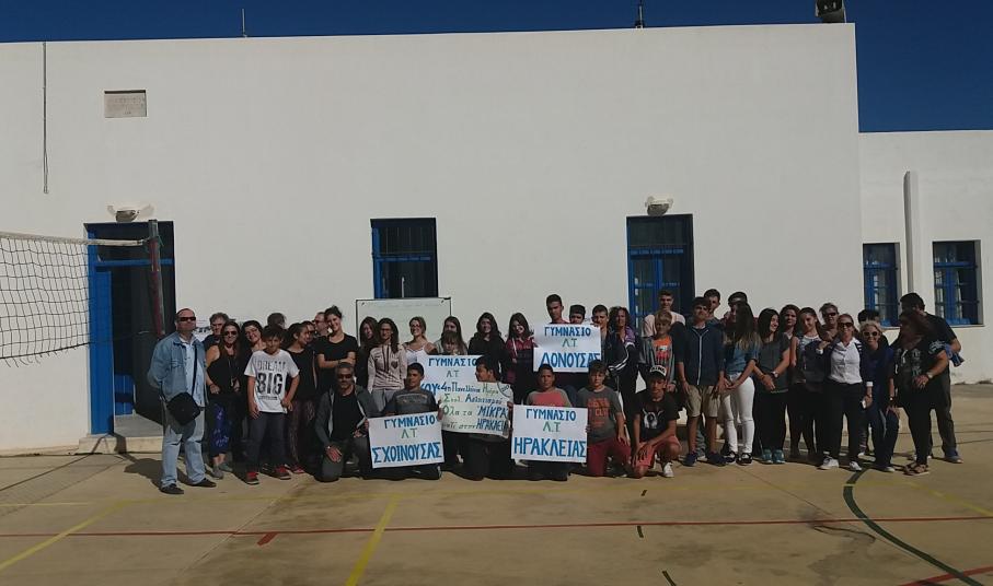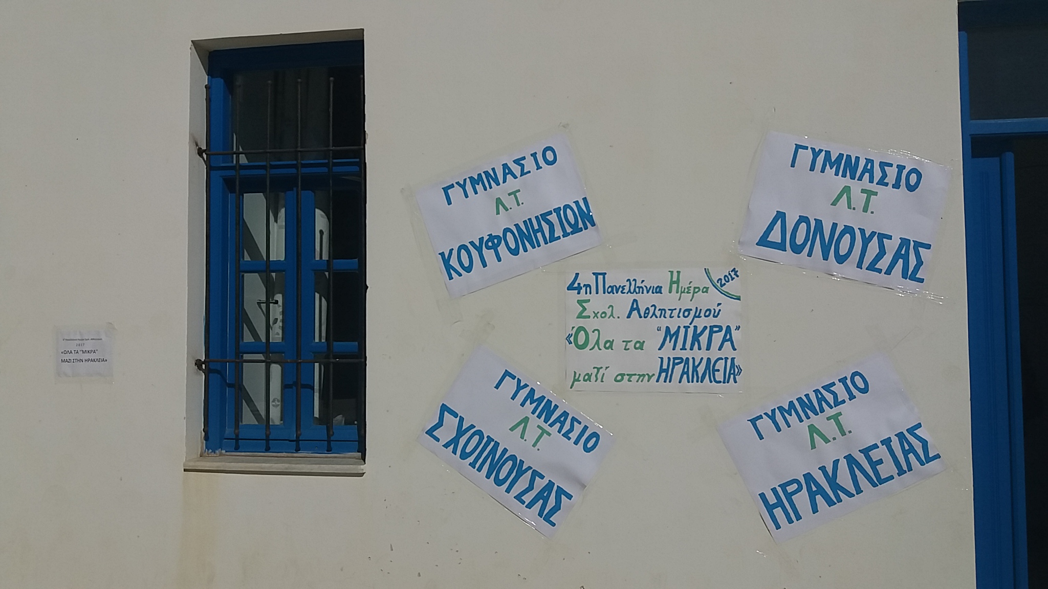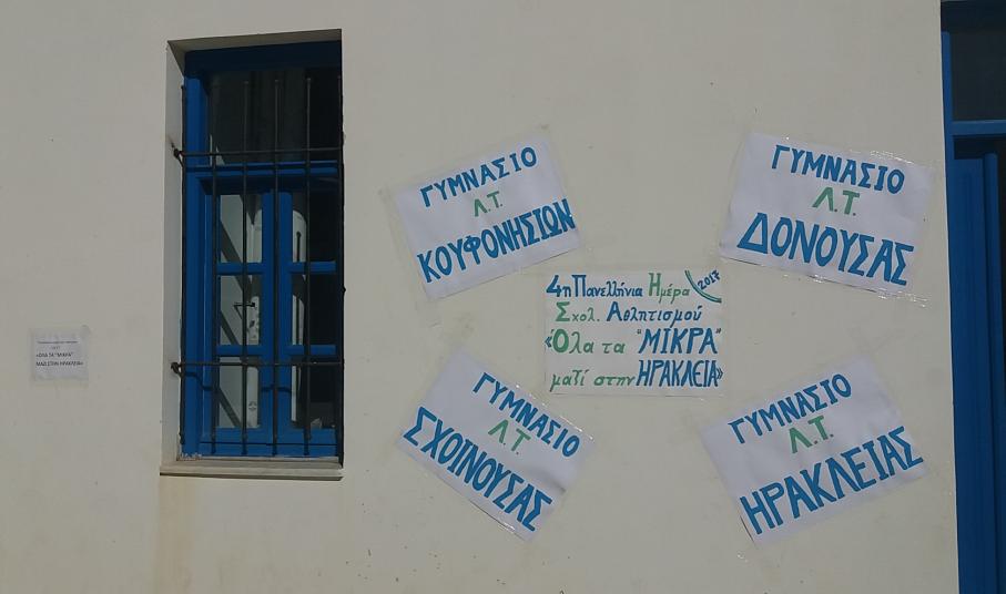 Στην Ηρακλειά συναντήθηκαν «όλα τα μικρά» Γυμνάσια με Λυκειακές Τάξεις της Ηρακλειάς, της Σχοινούσας, του Κουφονησίου και της Δονούσας την Τετάρτη 11-10-2017 για την πραγματοποίηση της 4ης Πανελλήνιας Ημέρας Σχολικού Αθλητισμού σύμφωνα με την ΥΑ 154710/Δ5/18-09-2017 και σχετική έγκριση της Διεύθυνσης Δευτεροβάθμιας Εκπαίδευσης Κυκλάδων. Παράλληλα με τις αθλητικές δραστηριότητες με έγκριση της Περιφερειακής Διεύθυνσης Εκπαίδευσης Ν. Αιγαίου της σχετικής αίτησης της Σχολικής Συμβούλου Παιδαγωγικής Ευθύνης των Σχολείων αυτών κ. Ουρανίας Ρινακάκη, πραγματοποιήθηκε επιμόρφωση όλων των εκπαιδευτικών των Σχολείων με θέμα: «Το Σχολείο ως Κοινότητα Μάθησης» και εισηγήτρια την Προϊσταμένη του Τμήματος Επιστημονικής και Παιδαγωγικής Καθοδήγησης της ΠΔΕ Ν. Αιγαίου κ. Τσαμπίκα Καράκιζα.