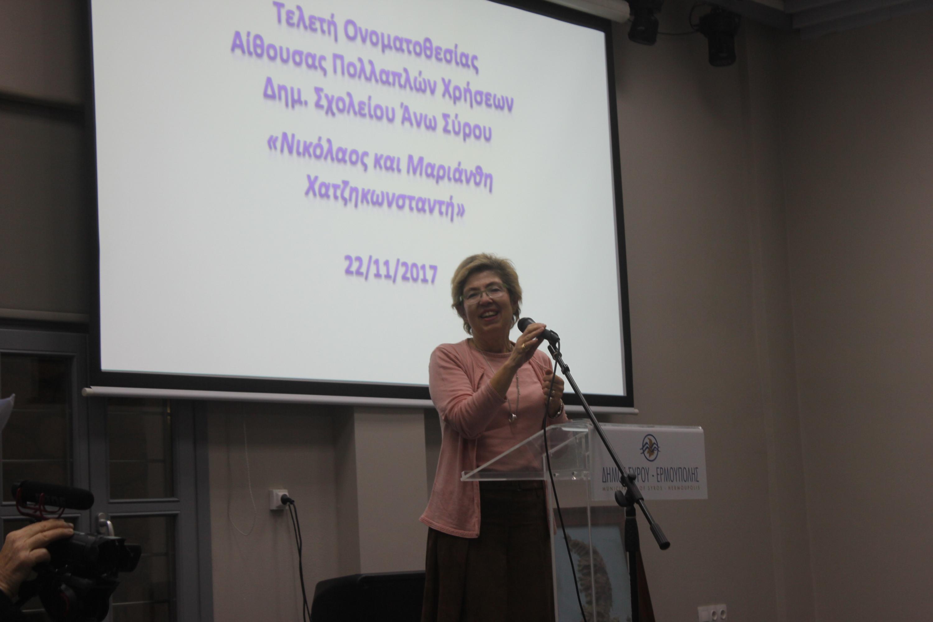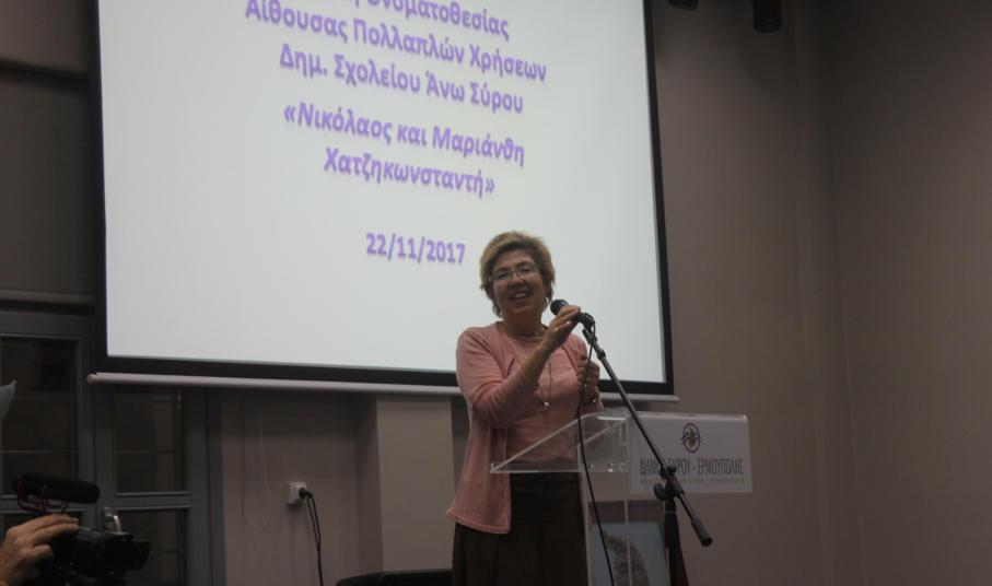 Ιδιαίτερα συναισθηματικός ήταν και ο λόγος της συνταξιούχου εκπαιδευτικού, τέως Διευθύντριας της Λεοντείου Σχολής Νέας Σμύρνης και παλιάς μαθήτριας του σχολείου, Νινέτας Φρέρη, η οποία μοιράστηκε με το κοινό μνήμες της από τα μαθητικά χρόνια της στο Δημοτικό της Άνω Σύρου με δασκάλους τον Νίκο και την Μαριάνθη Χατζηκωνσταντή.