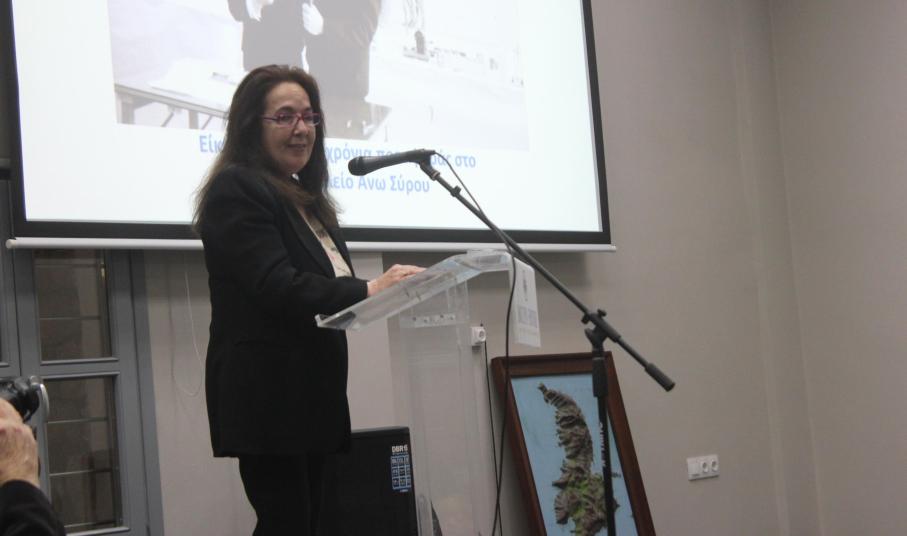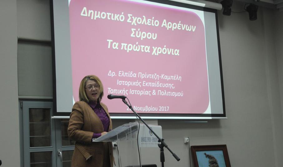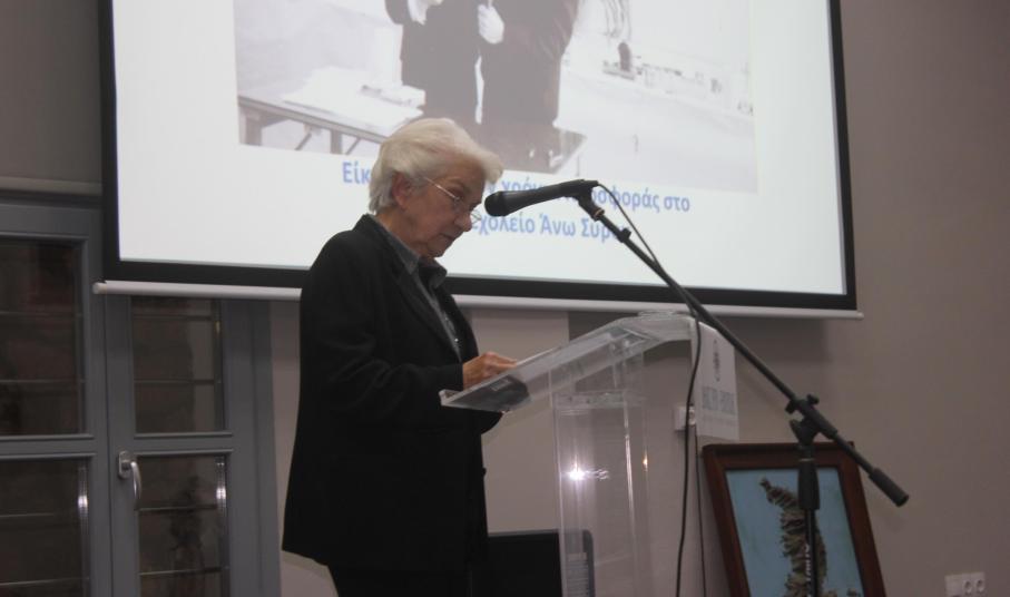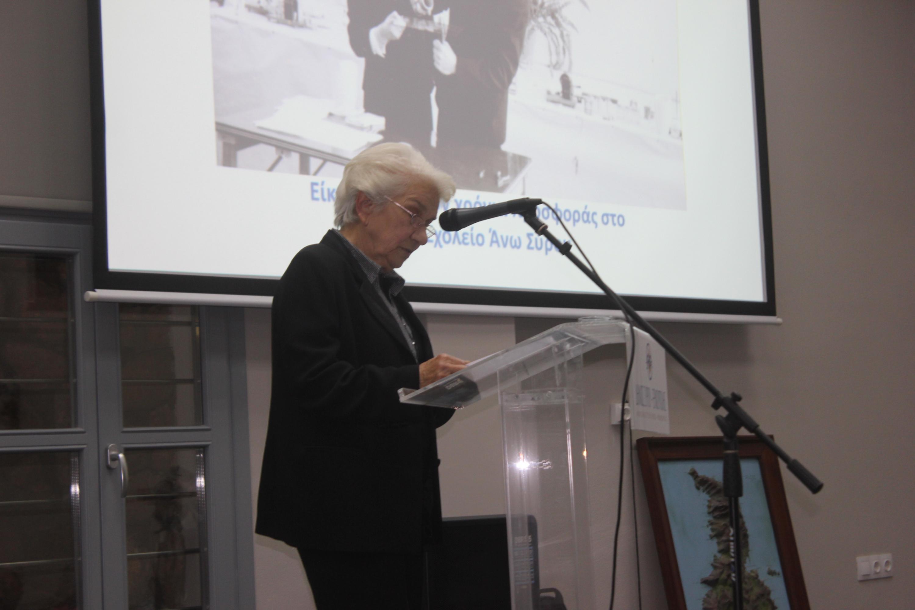 Κατά τη διάρκεια της εκδήλωσης, η διδάκτωρ του Πανεπιστημίου Ιωαννίνων, τέως σχολική σύμβουλος προσχολικής αγωγής και ερευνήτρια της ιστορίας της εκπαίδευσης στη Σύρο Ελπίδα Πρίντεζη-Καμπέλη παρουσίασε μια ενδιαφέρουσα εισήγηση με θέμα την ιστορία του Δημοτικού Σχολείου Άνω Σύρου από τα πρώτα έτη της ίδρυσής του το 1835.