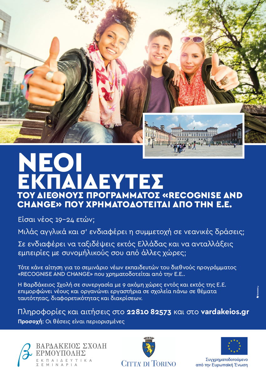 Είσαι νέος από 19 έως 24 ετών; Μιλάς αγγλικά και σ’ ενδιαφέρει η συμμετοχή σε νεανικές δράσεις; Θα ήθελες να ταξιδέψεις εκτός Ελλάδας και να ανταλλάξεις εμπειρίες με συνομήλικούς σου από άλλες χώρες; Η Βαρδάκειος Σχολή Ερμούπολης σου δίνει την ευκαιρία να το πράξεις, μέσω του διεθνούς προγράμματος “Recognise and Change”, που χρηματοδοτείται από την Ευρωπαϊκή Ένωση.