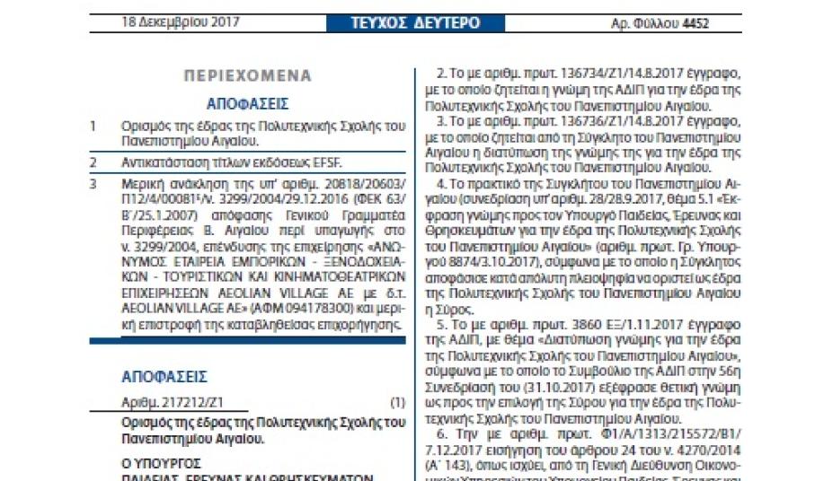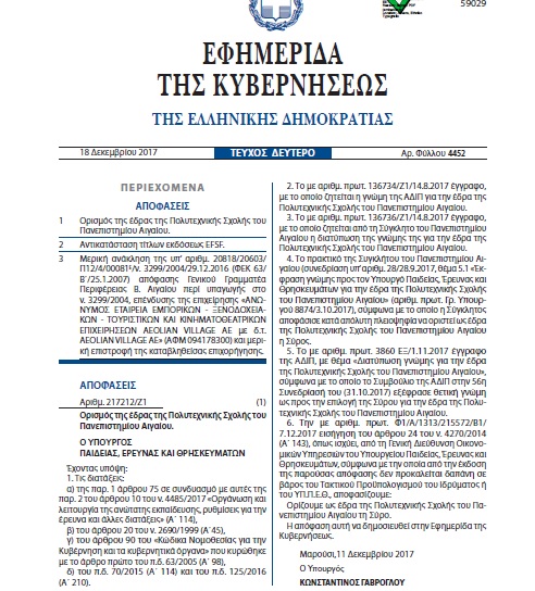 Επισφραγίστηκε με τον πλέον επίσημο τρόπο ο ορισμός της Σύρου ως έδρας της Πολυτεχνικής Σχολής του Πανεπιστημίου Αιγαίου με την έκδοση της απόφασης του Υπουργού Παιδείας, Κώστα Γαβρόγλου στο σχετικό ΦΕΚ (Αρ. Φύλλου 4452), προχθές (18/12), εξέλιξη που άμεσα γνωστοποιήθηκε και “πλημμύρισε” με συναισθήματα ανακούφισης και ικανοποίησης το σύνολο των μελών της τοπικής κοινωνίας, των συλλογικών φορέων, της Πανεπιστημιακής κοινότητας, των αυτοδιοικητικών καθώς και των κυβερνητικών βουλευτών των Κυκλάδων.