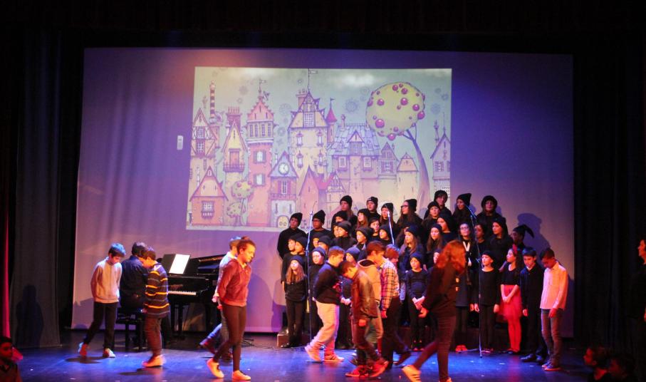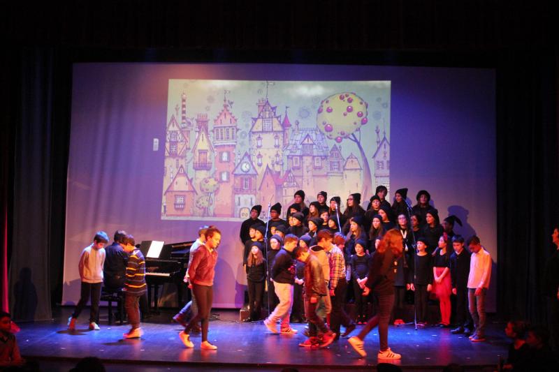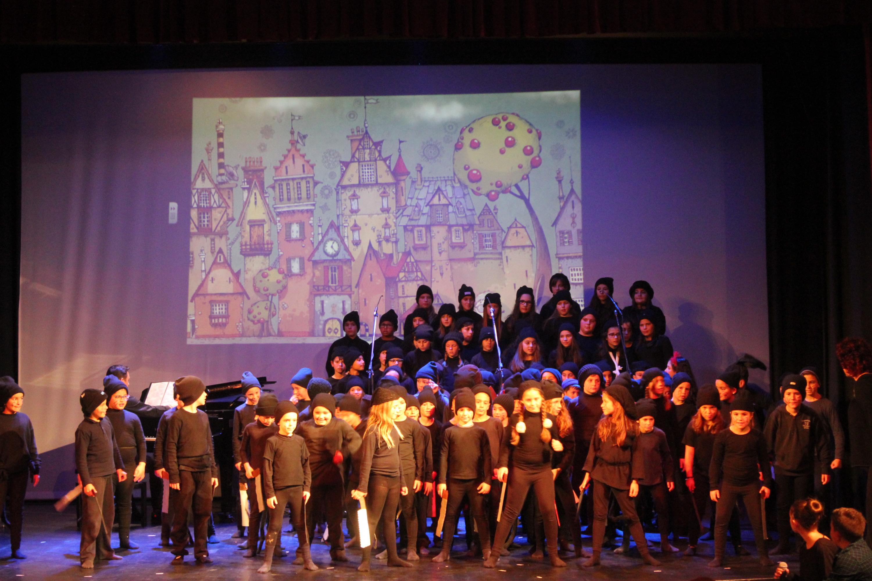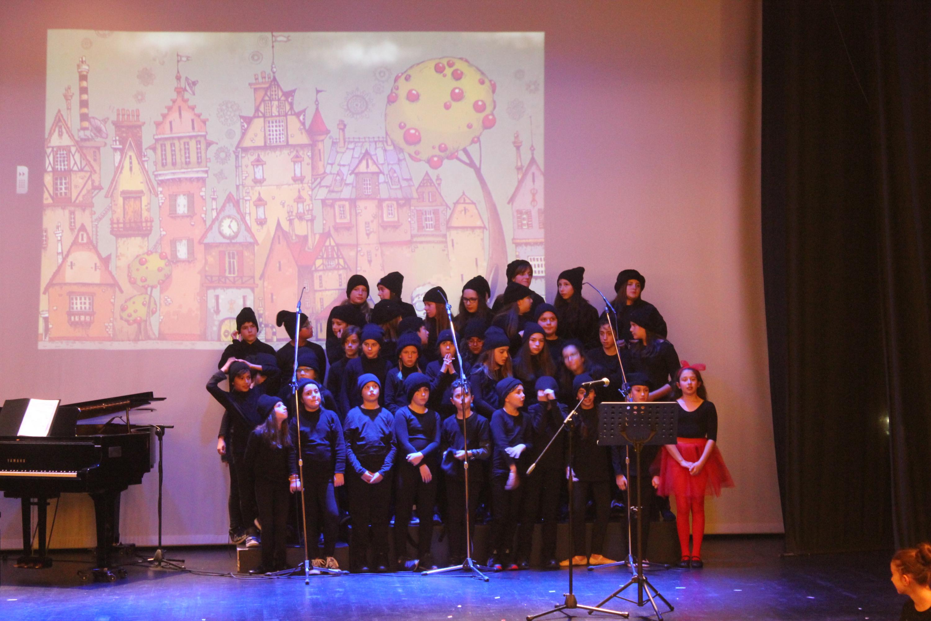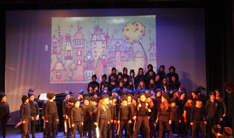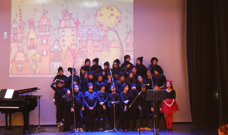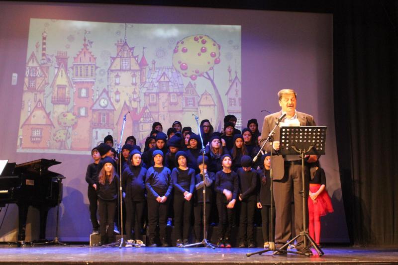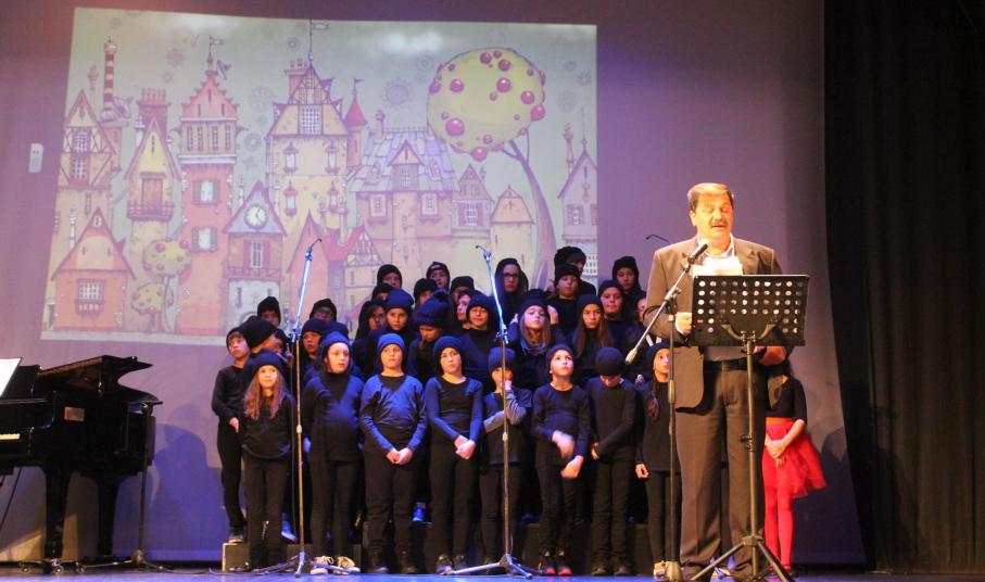Παιδιά και εκπαιδευτικοί παρουσίασαν με επιτυχία το γνωστό μουσικοχορευτικό παραμύθι των Χάρη και Πάνου Κατσιμίχα «Η Αγέλαστη Πολιτεία και οι Καλικάντζαροι», μία διαχρονική ιστορία με noir απόχρωση, ροκ διάθεση και σπουδαία τραγούδια, τα οποία ερμήνευσε ζωντανά η χορωδία του σχολείου, υπό τη διεύθυνση του μουσικού Γιάννη Ρηγούτσου.