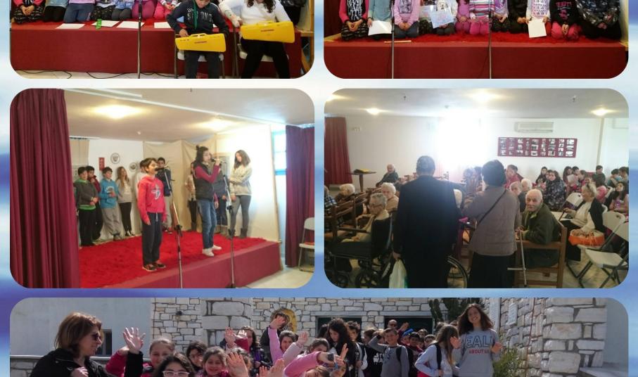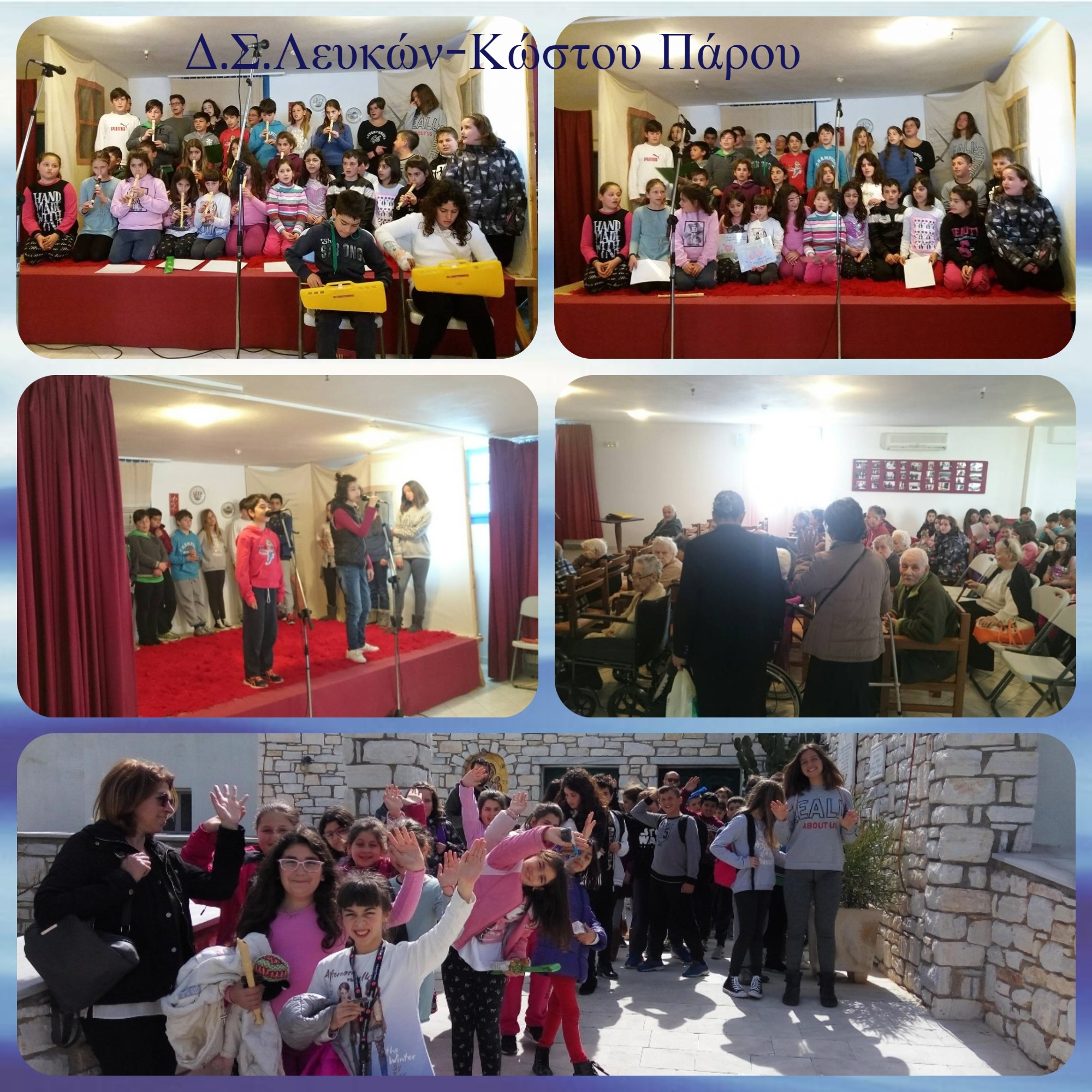 Τα παιδιά των Δ’, Ε’ και Στ’ τάξεων του Δ.Σ. Λευκών-Κώστου τραγούδησαν, συστήθηκαν με θεατρικό τρόπο , γνωρίστηκαν και κουβέντιασαν με τους ηλικιωμένους που διαμένουν εκεί. Επίσης ήρθαν σε επαφή με την εθελοντική ομάδα που προσφέρει σημαντικό έργο στο Γηροκομείο Πάρου. Οι μαθητές έφτιαξαν ομαδικές εργασίες για να γεμίσει για να γεμίσει με τα έργα τους, χρώμα κι ελπίδα η αίθουσα εκδηλώσεων του Γηροκομείου. Οι γονείς ετοίμασαν τα κεράσματα. Με την παρουσία τους γέμισαν χαρά τους ηλικιωμένους που διαβιούν εκεί.