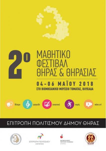 Το 2ο Μαθητικό Φεστιβάλ Θήρας και Θηρασιάς με την επιμέλεια της Επιτροπής Πολιτισμού του Δήμου Θήρας θα διεξαχθεί από 4 έως 6 Μαΐου 2018 στο Εργοστάσιο Τεχνών Σαντορίνης (SAF), στη Βλυχάδα.
