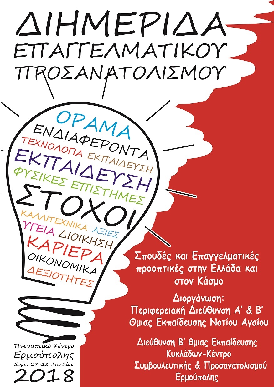 Η Περιφερειακή Διεύθυνση Α'& Β΄θμιας Εκπαίδευσης Νοτίου Αιγαίου, η Διεύθυνση Β΄θμιας Εκπαίδευσης Κυκλάδων - Κέντρο Συμβουλευτικής & Προσανατολισμού Ερμούπολης διοργανώνουν διημερίδα επαγγελματικού προσανατολισμού Παρασκευή και Σάββατο 27 και 28 Απριλίου στη Σύρο.