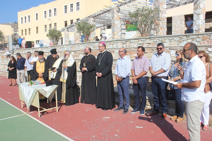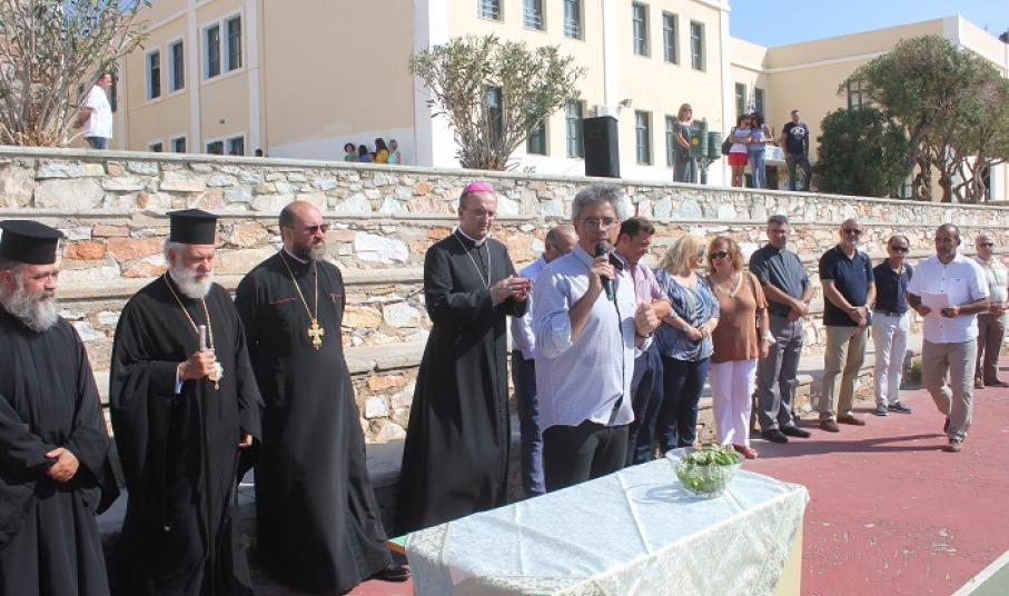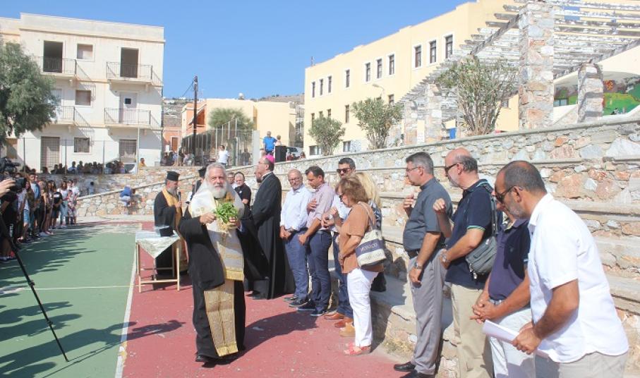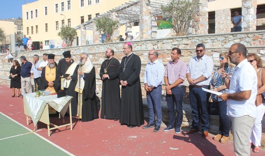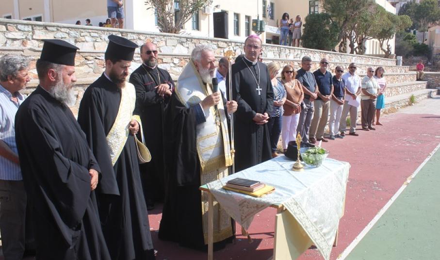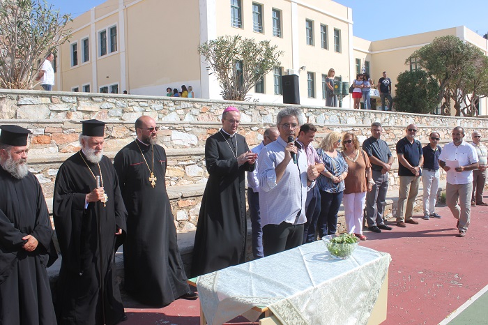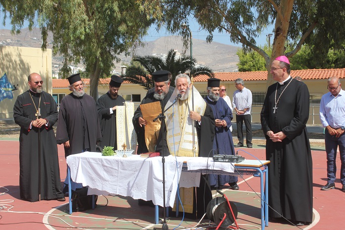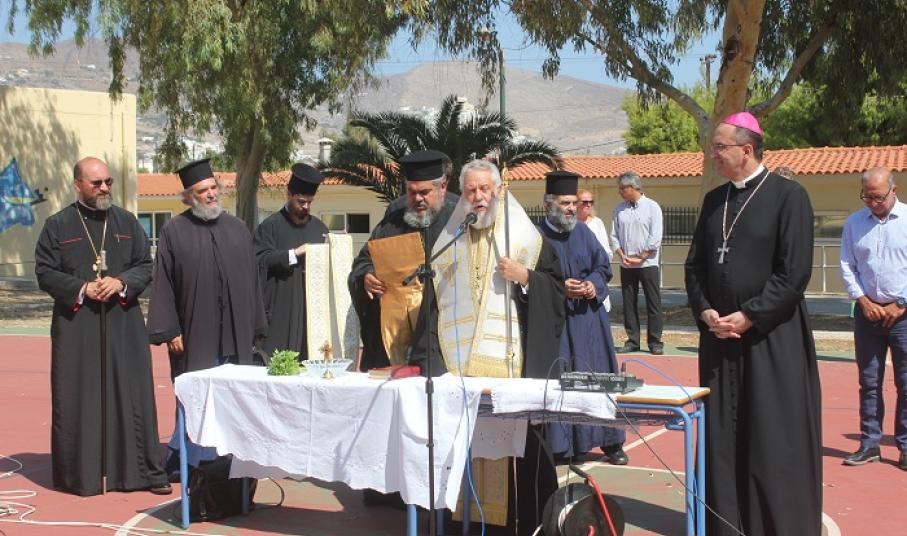 Τον αγιασμό τέλεσε ο Σεβασμιώτατος Μητροπολίτης Σύρου κ. Δωρόθεος Β’, πλαισιωμένος από κληρικούς της Ιεράς Μητρόπολης, ενώ τις ευχές του απηύθυνε στους μαθητές και ο Καθολικός Επίσκοπος Σύρου Σεβ. π. Πέτρος Στεφάνου.