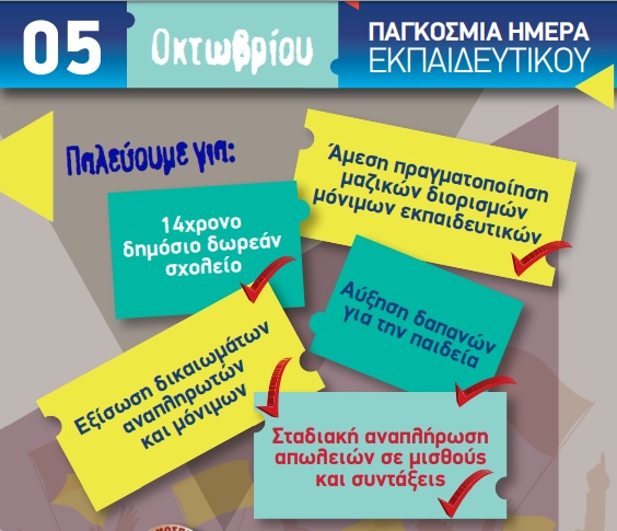 Σε αυτή την κατεύθυνση ο σύλλογος, όπως και πέρσι, προκηρύσσει 3ωρη στάση εργασίας (3 πρώτες ώρες του πρωινού/3 τελευταίες του ολοήμερου) για την Παρακευή 5 Οκτώβρη ώστε μαζί με την 3ωρη στάση που κήρυξε η ΔΟΕ (3 τελευταίες ώρες του πρωινού/3 πρώτες του απογευματινού), η ημέρα να μετατρέπεται σε 24ωρη απεργία, προκειμένου να αξιοποιηθεί για τη μετάβαση στη διαδήλωση της Αθήνας.