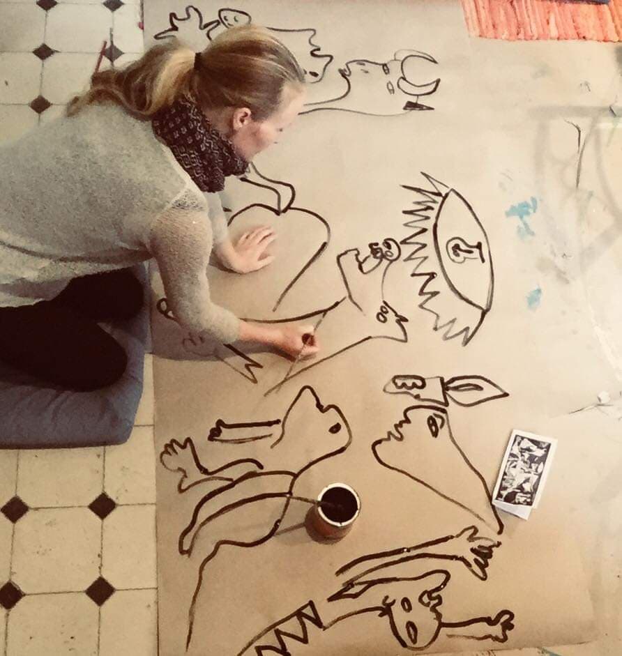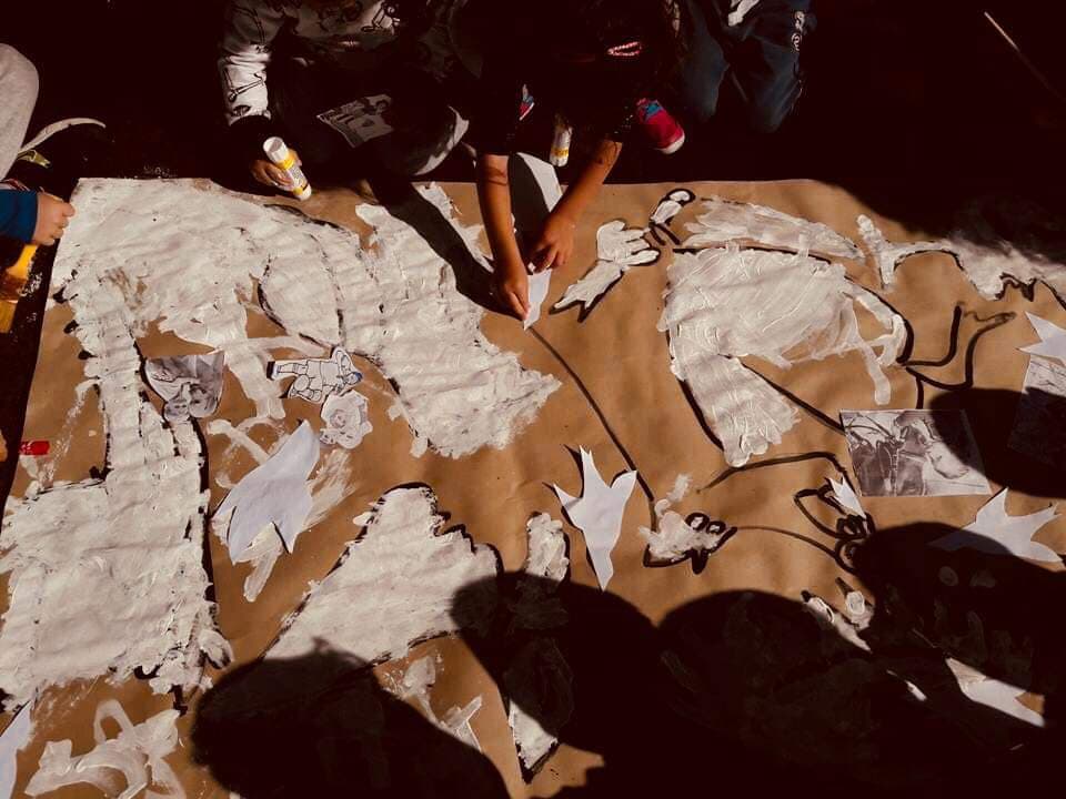 Στη συνέχεια, παιδιά και εκπαιδευτικοί βγήκαν στην αυλή και δούλεψαν πάνω σε μια απλή «βάση» της Guernica, την οποία είχα ετοιμάσει η υπεύθυνη του ΔΕΕΠΣ. Οι μικροί μαθητές μεταμόρφωσαν μια σκηνή πολέμου σε σκηνή ειρήνης, ζωγραφίζοντας άσπρες τις σχεδιασμένες φιγούρες του πίνακα και προσθέτοντας τα δικά τους σύμβολα ειρήνης.