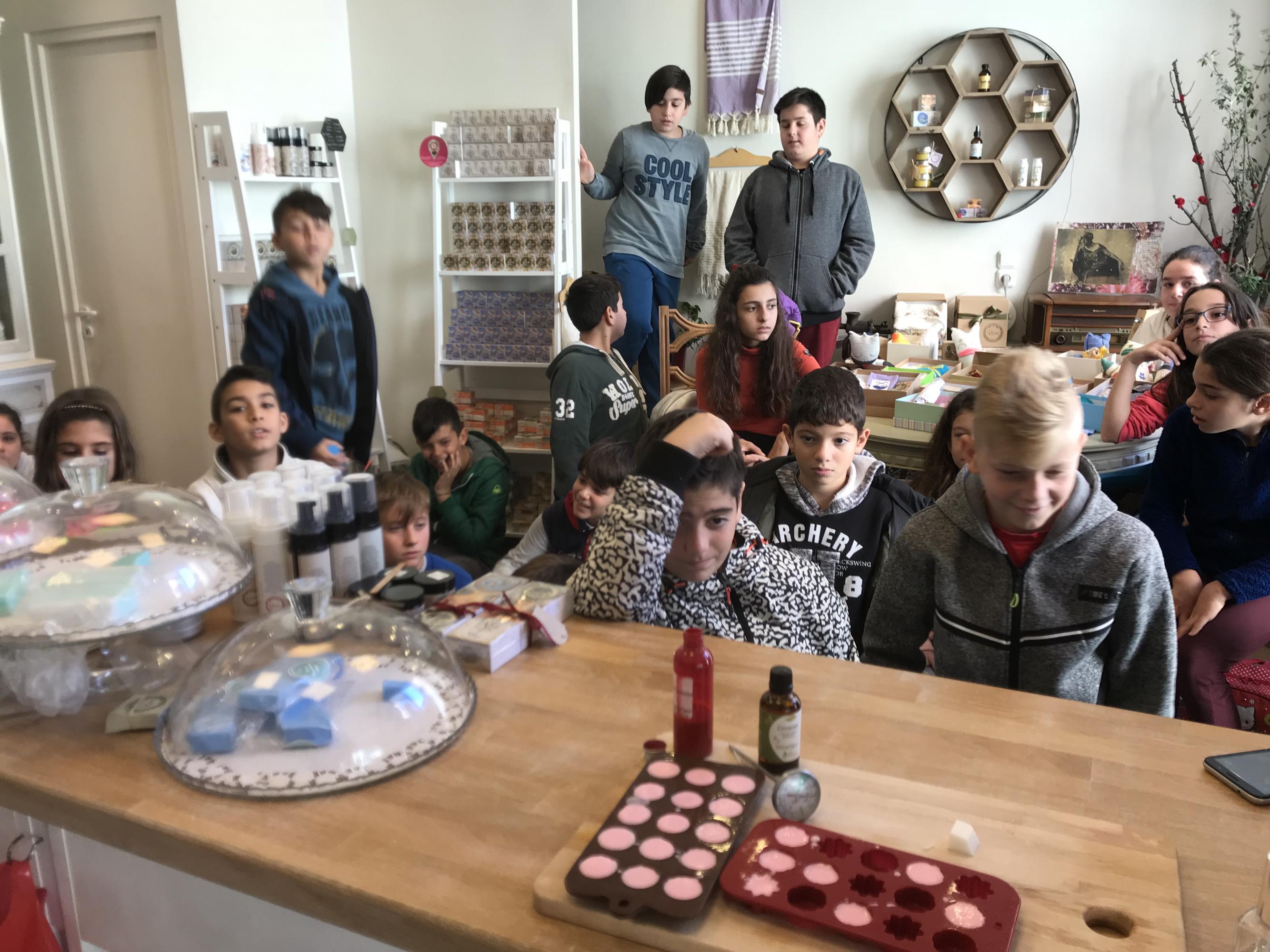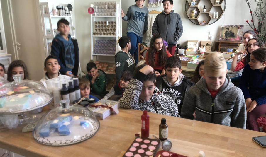 Η κ. Αργυρένια αφού καλωσόρισε τους μαθητές μας στον "παραμυθένιο" χώρο της, τούς έδειξε με πολλή αγάπη, μεράκι και προσήλωση στις παραδοσιακές συνταγές των γιαγιάδων, πώς παρασκευάζεται το σαπούνι λουκούμι τριαντάφυλλο με την ιδιαίτερα ντελικάτη δροσερή μυρωδιά καθώς και το σαπούνι περγαμόντο με το φίνο άρωμά του.